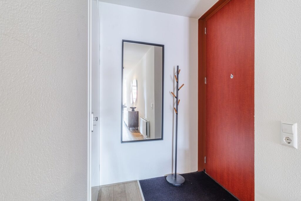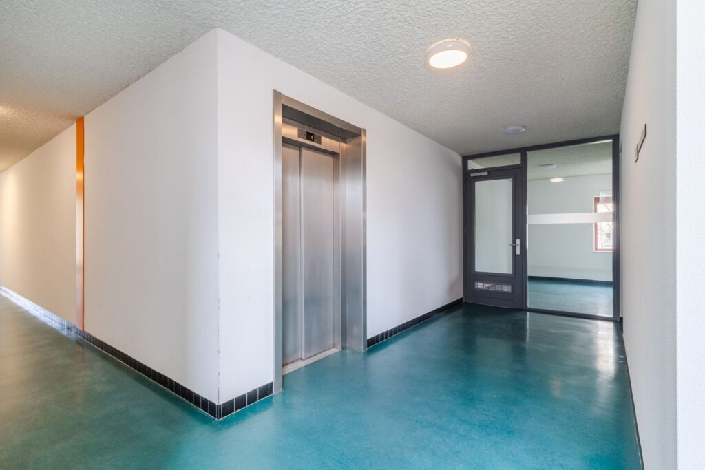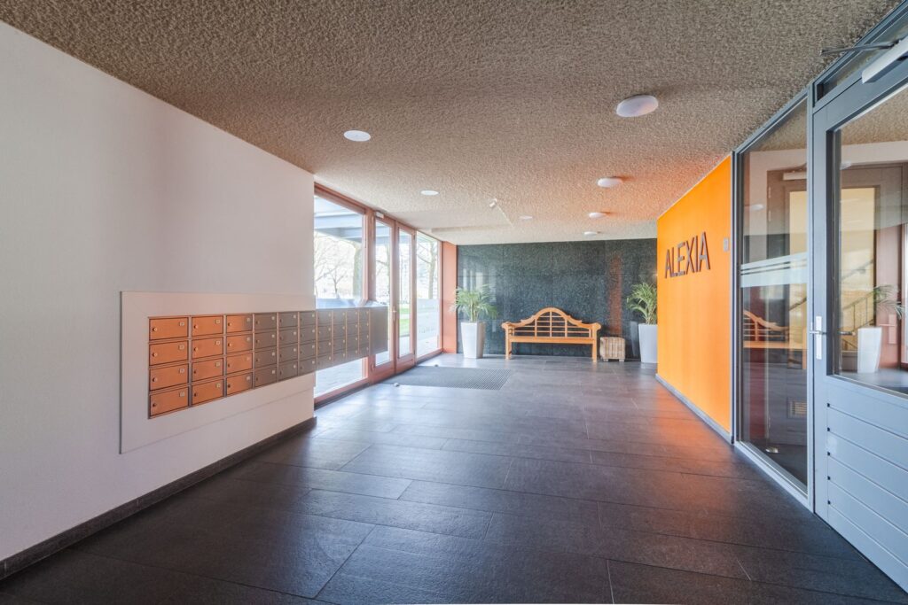 Keurig afgesloten portiek met brievenbussen en een bellentableau. Hier bevindt zich ook de liftinstallatie, trappenhuis en is er toegang tot de gemeenschappelijke fietsenberging.