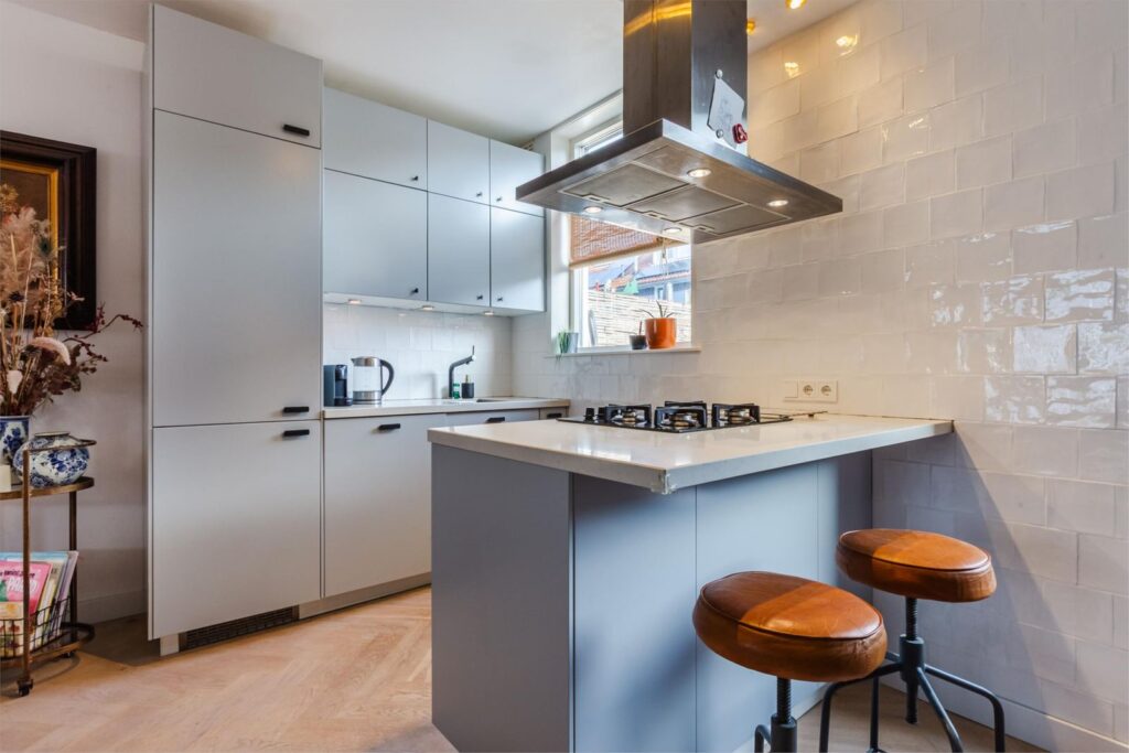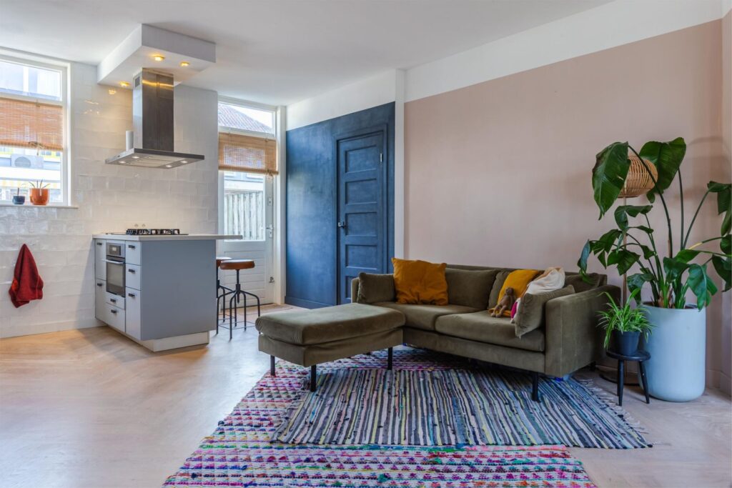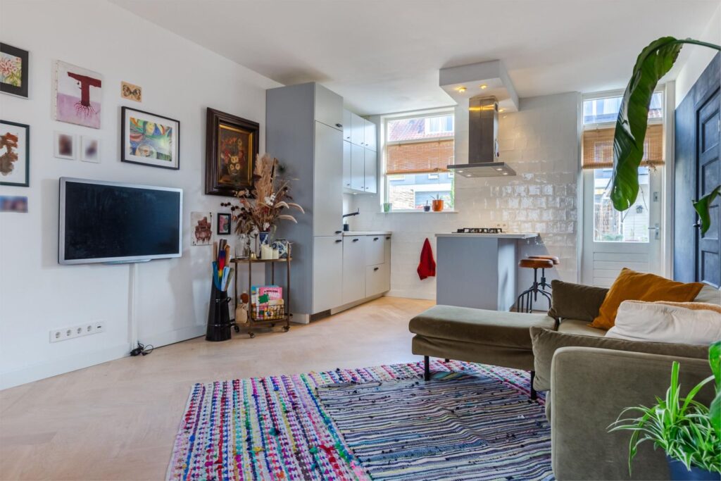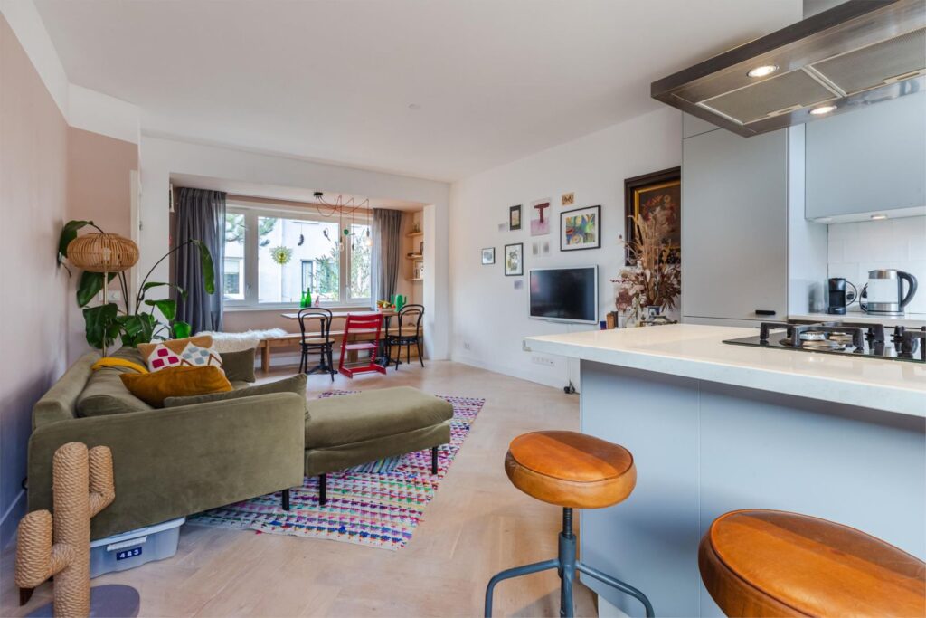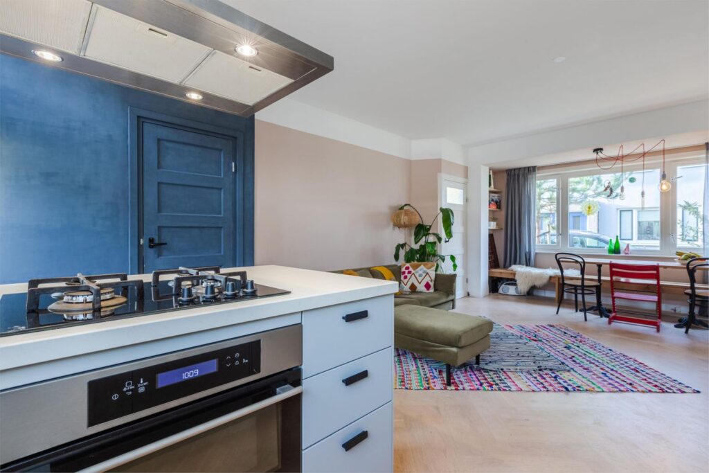 De opengetrokken kamer zorgt voor veel lichtinval en bewegingsvrijheid, waarbij de leefkeuken met kook schiereiland uitnodigt om gezellig aan te schuiven.