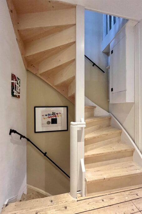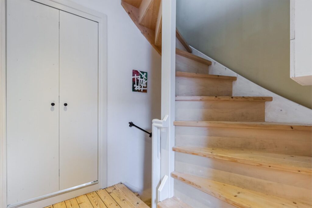 Via de klassieke trapopgang biedt de eerste verdieping toegang tot de badkamer en twee slaapvertrekken.