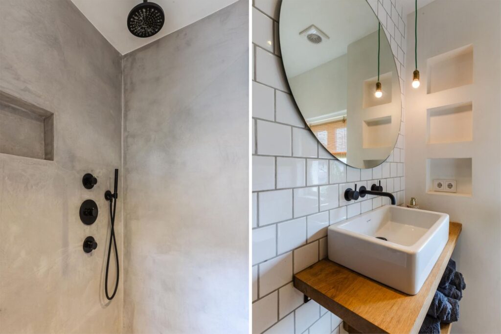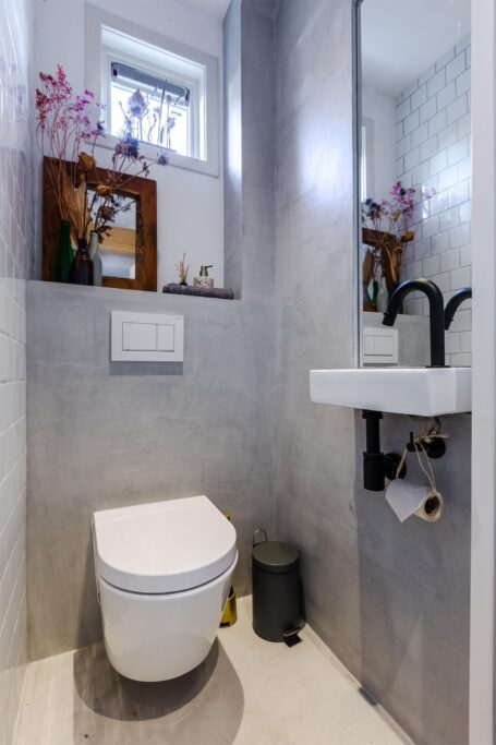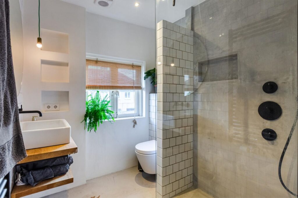 De industrieel minimalistische inrichting van de badkamer is ruimtelijk van opzet en van alle gemakken voorzien. Het Italiaans design sanitair van Hotbath geeft deze ruimte extra luxe en vergroten het wellness gevoel.