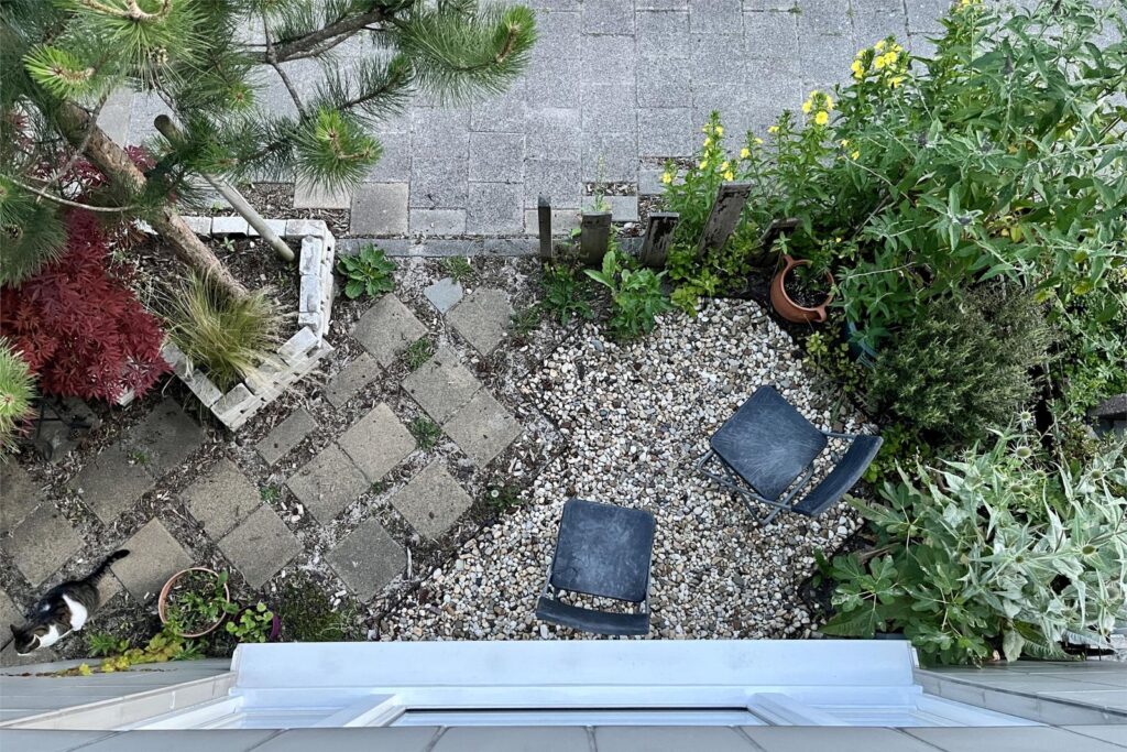 Door de schaduw werping vraagt het groen minder intensieve verzorging terwijl er achterin de tuin voldoende ruimte is om te zonnen.