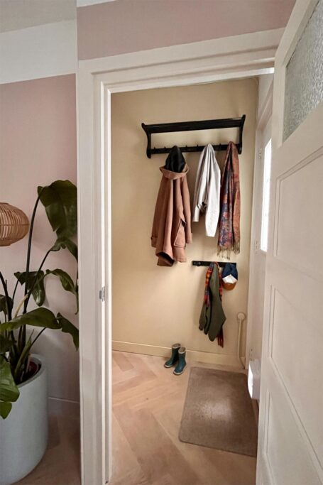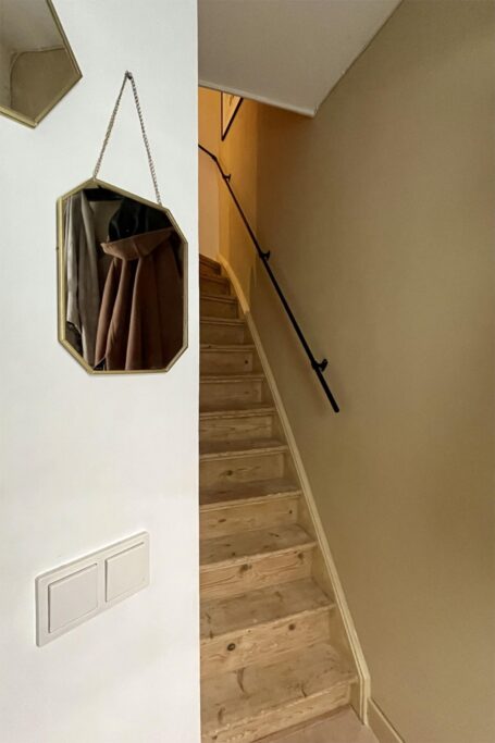 Bij binnenkomst word je verrast door de hoogte van de klassieke trapopgang en is er ruimte om je jas op te hangen.