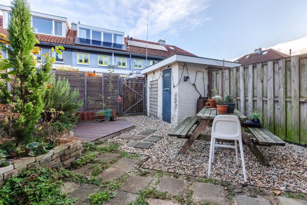 De achtertuin gelegen op het noordoosten is tevens klimaatbestendig ingericht waardoor deze ruimte, vooral tijdens hetere dagen, een genot is om in te verblijven.