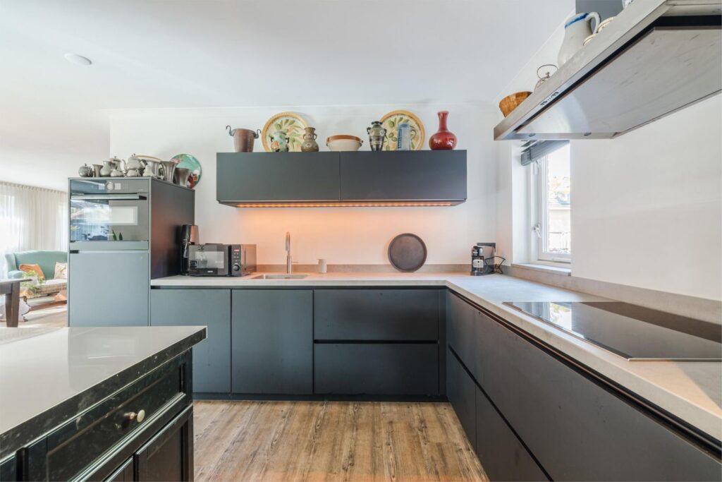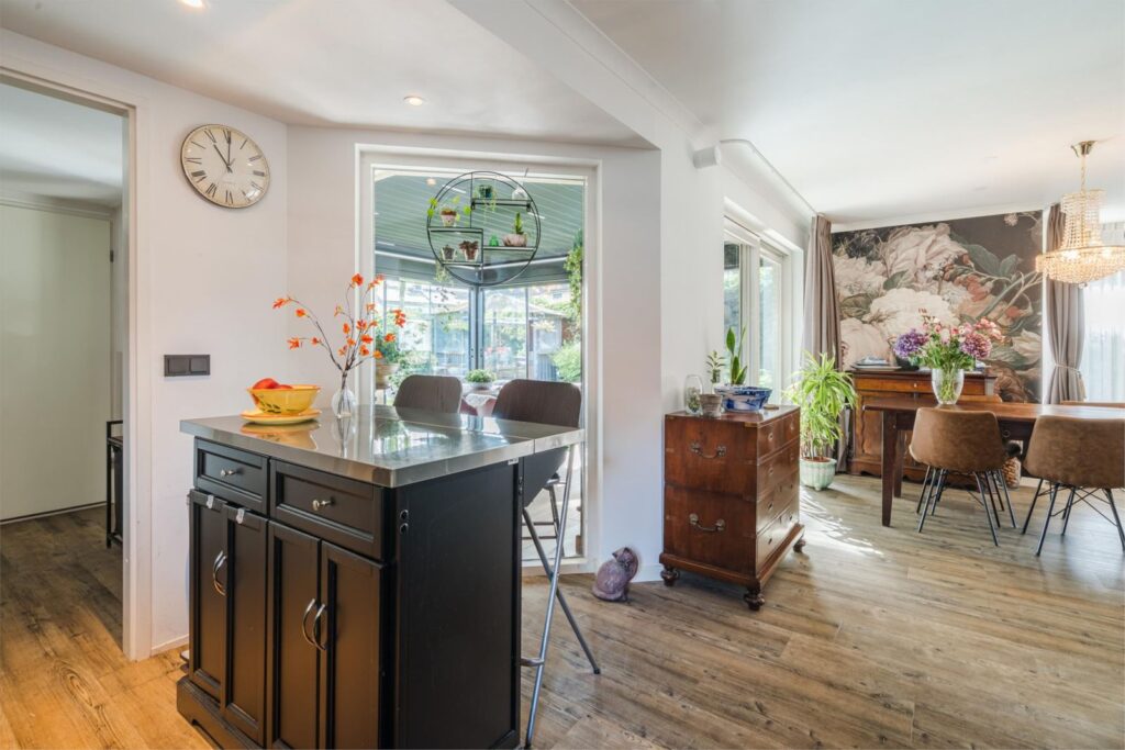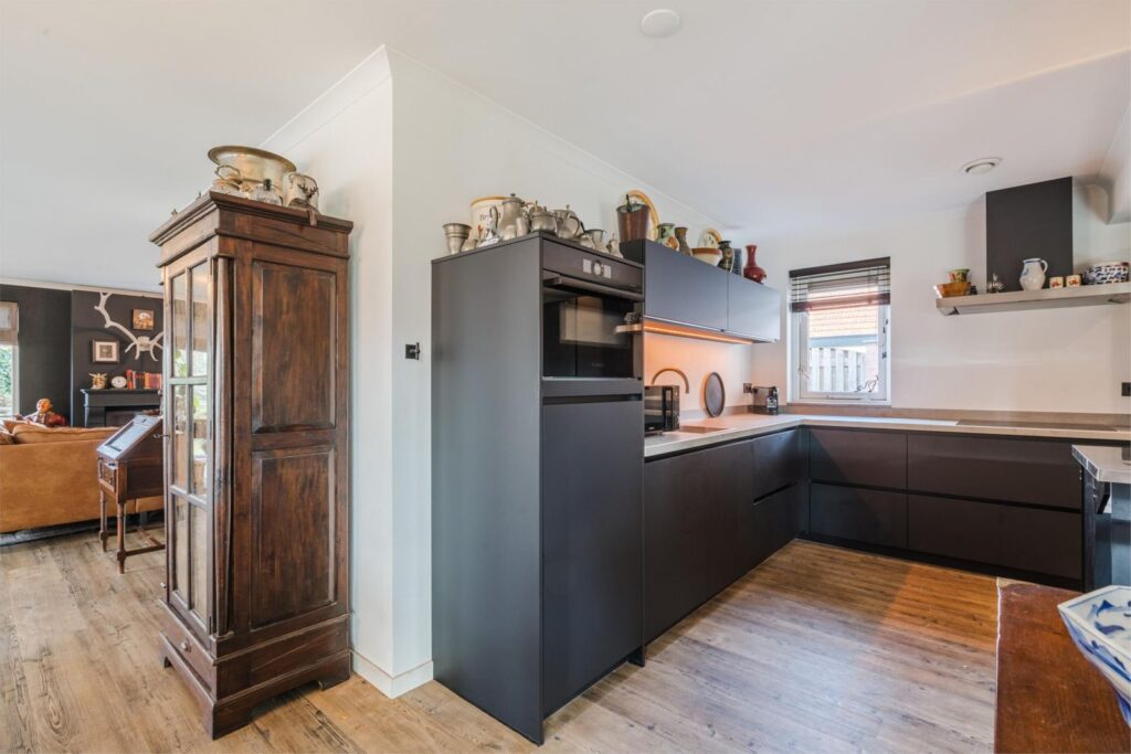 De luxe open keuken is uitgerust met moderne inbouwapparatuur, zoals een Quooker, Novy afzuigkap, combimagnetron, vaatwasmachine, inductiekookplaat en koelkast.