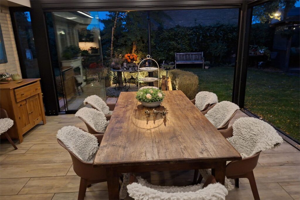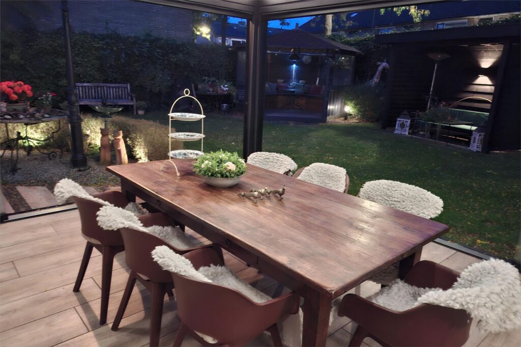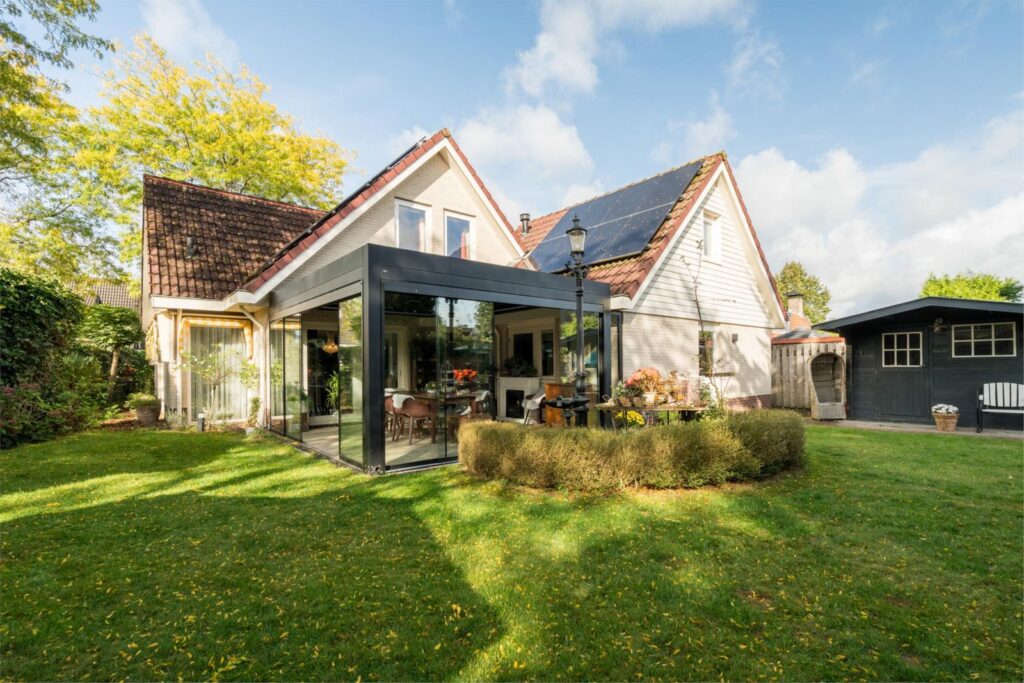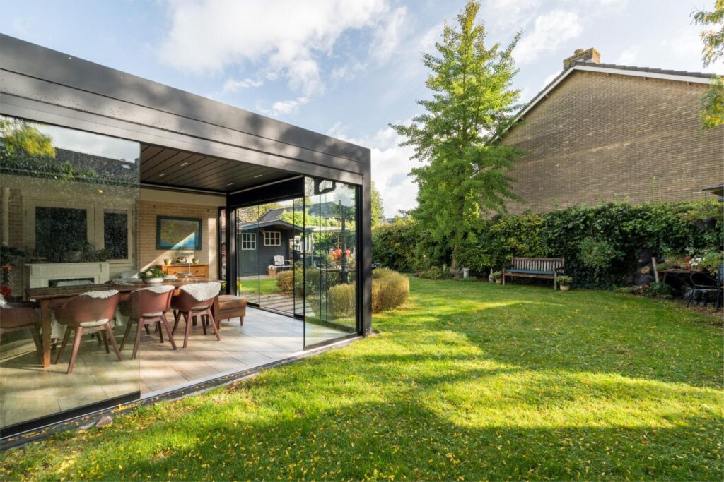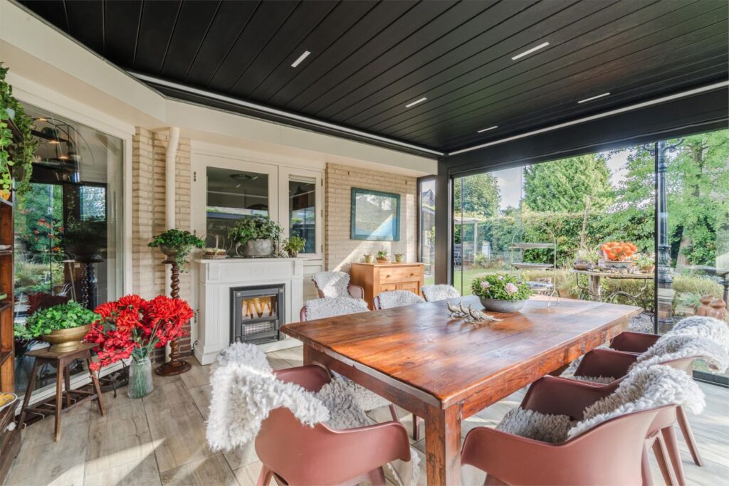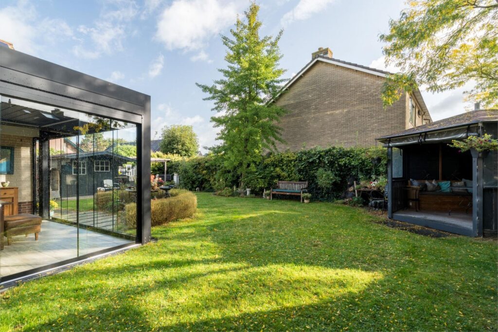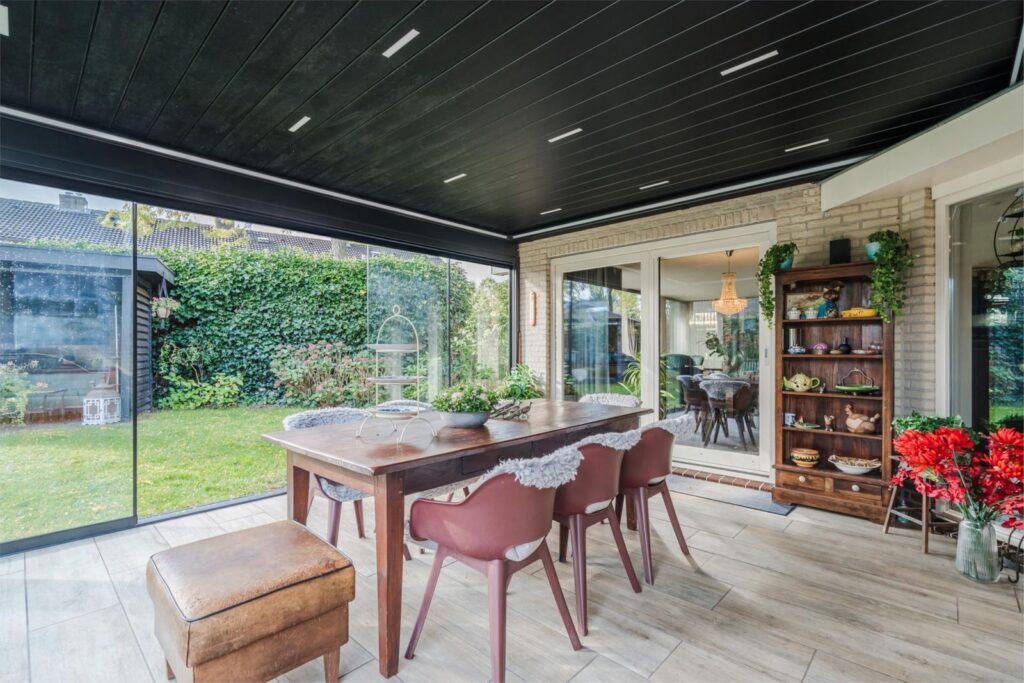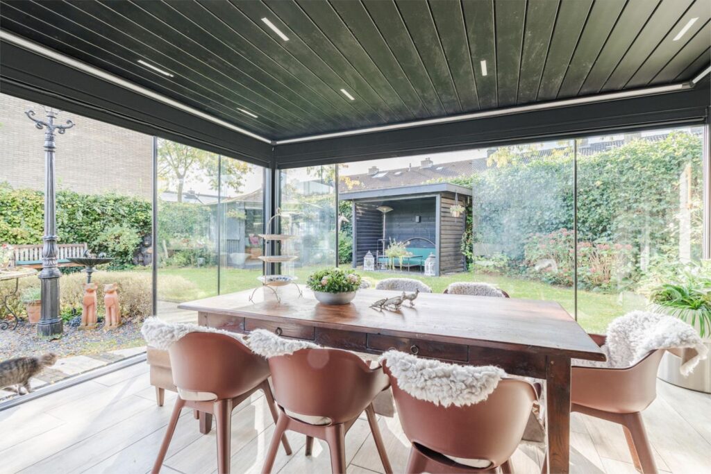 Vanuit de woonkamer biedt een schuifpui toegang tot een luxe tuinkamer, voorzien van een overkapping met verlichting en elektrisch bedienbare screens. De overkapping heeft glazen schuifwanden, zodat u het gehele jaar wind- en regenvrij kunt genieten van deze heerlijke buitenruimte.