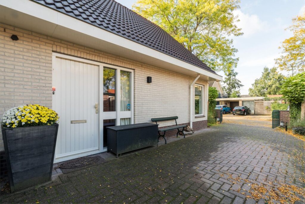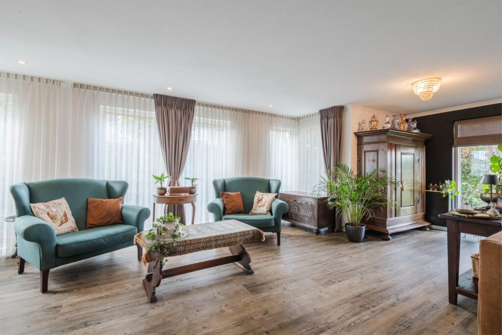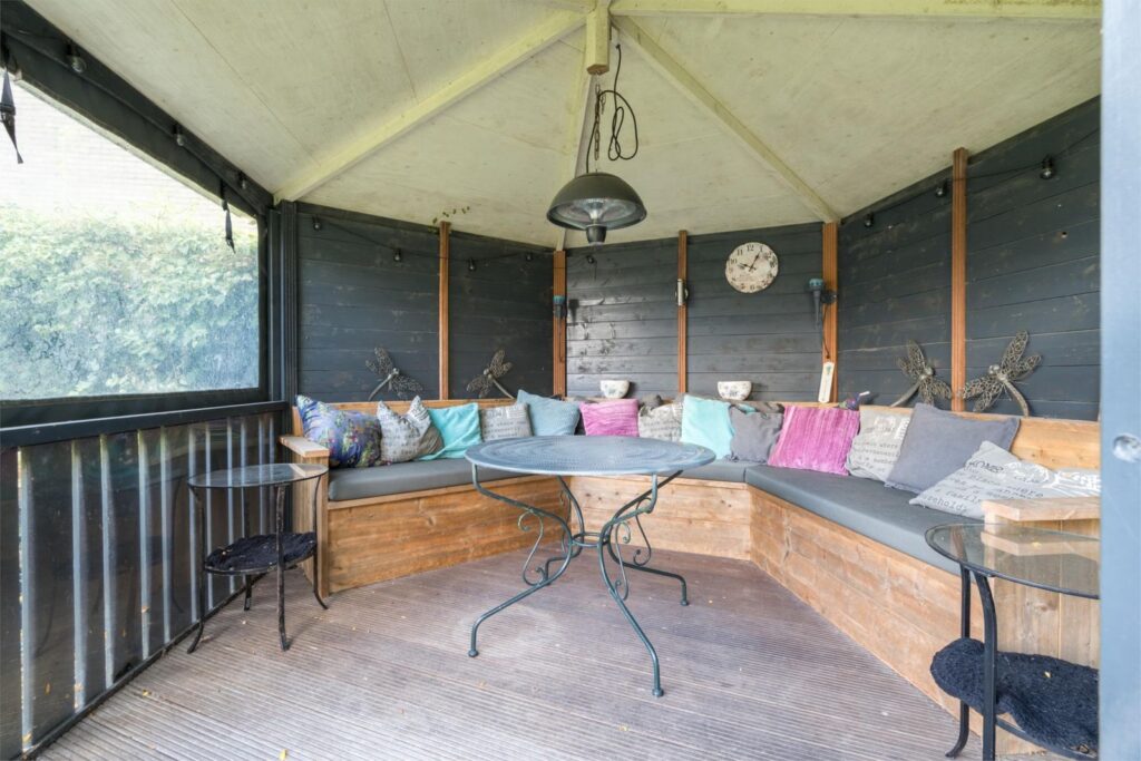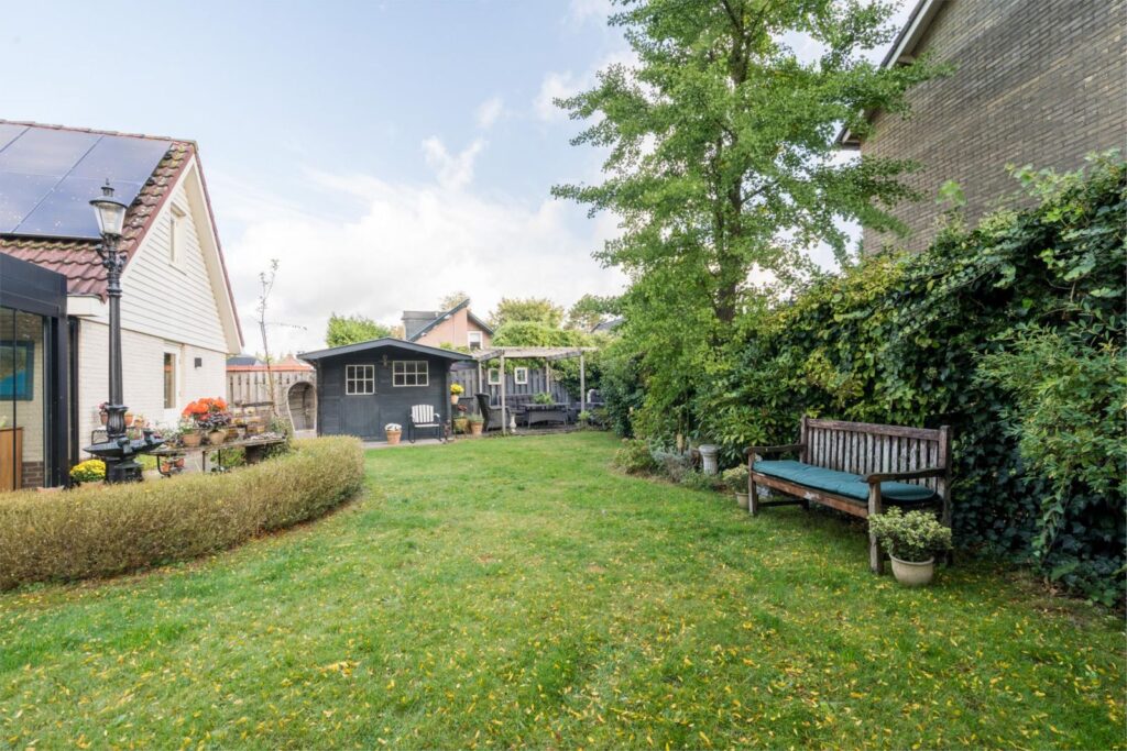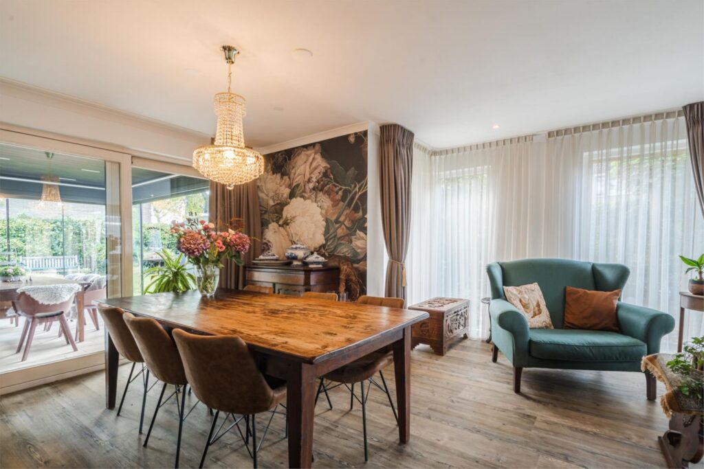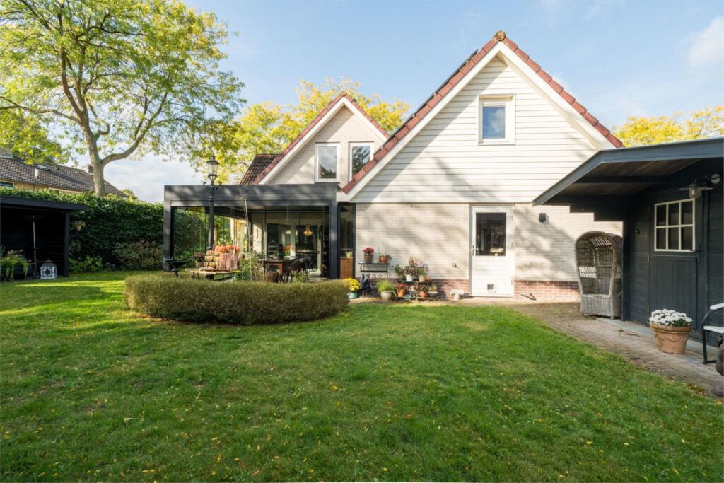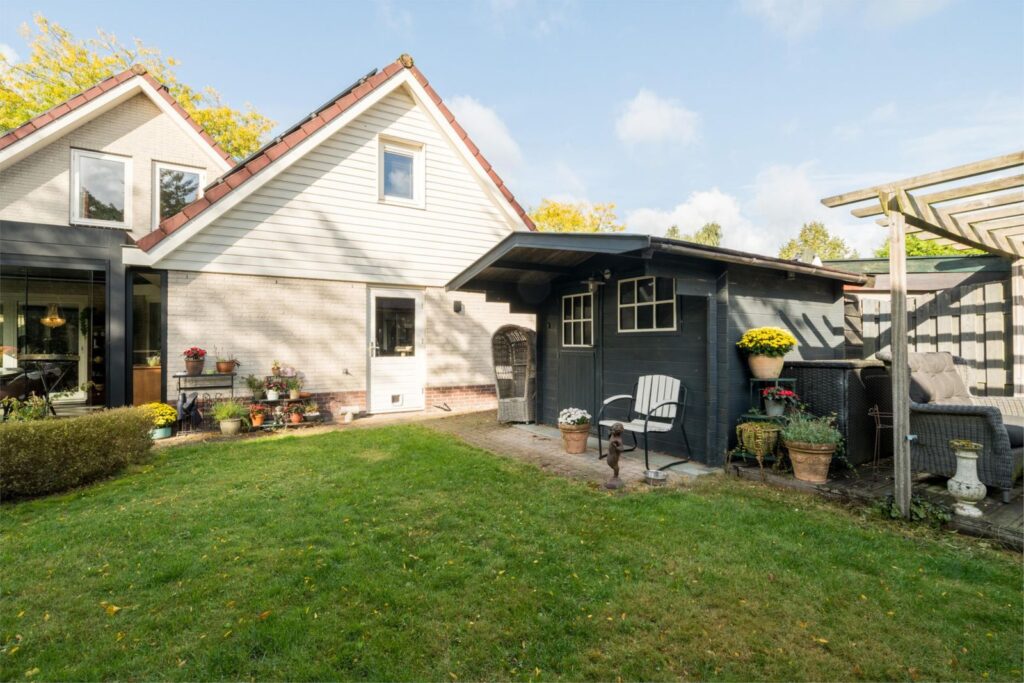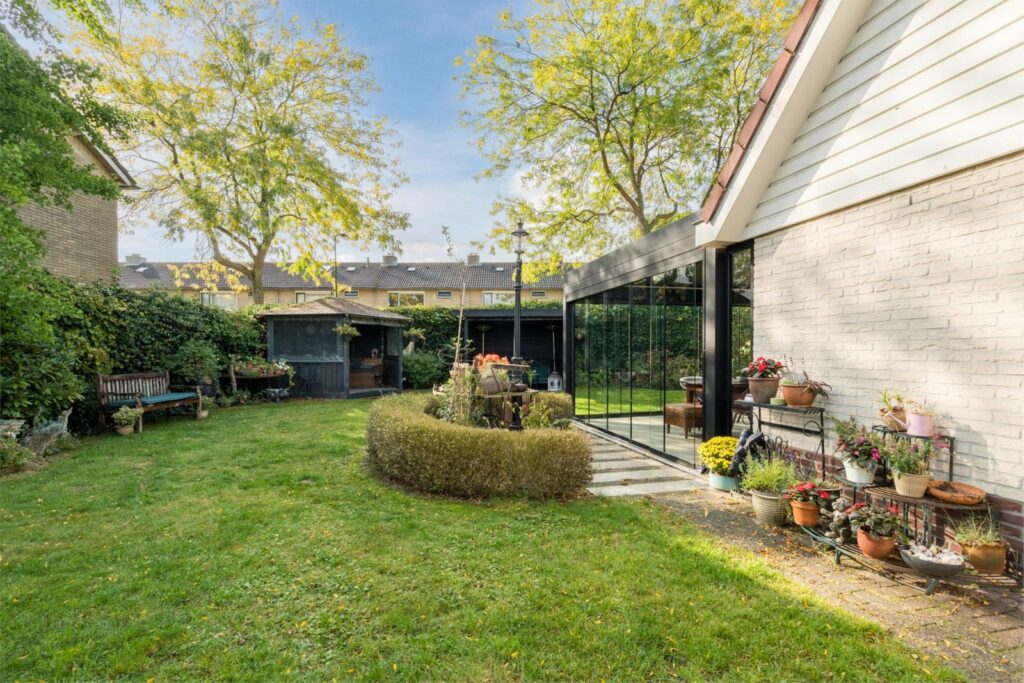 Vanuit de woonkamer biedt een schuifpui toegang tot een luxe tuinkamer, voorzien van een overkapping met verlichting en elektrisch bedienbare screens. De overkapping heeft glazen schuifwanden, zodat u het gehele jaar wind- en regenvrij kunt genieten van deze heerlijke buitenruimte.