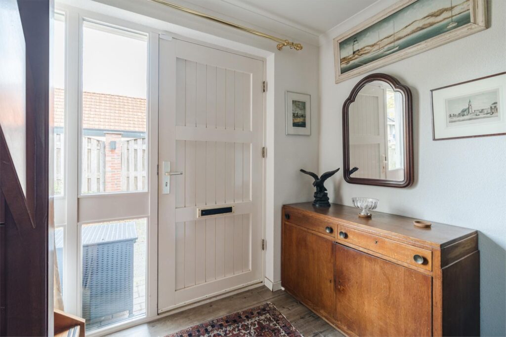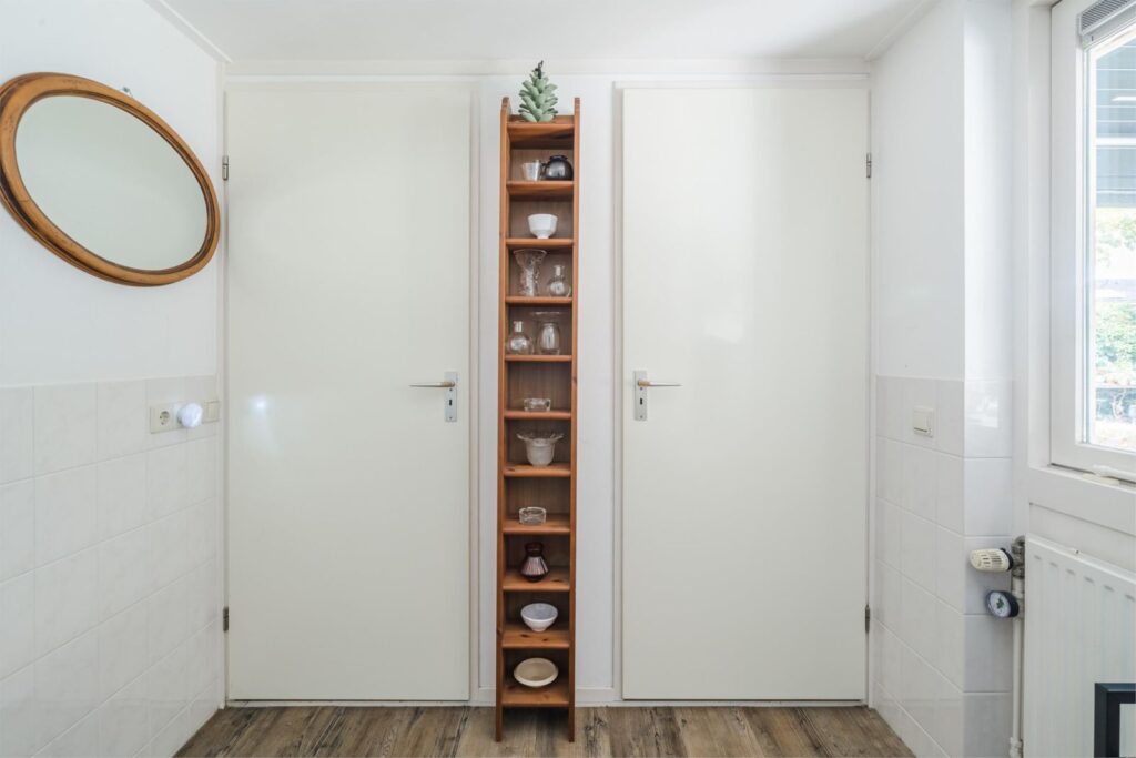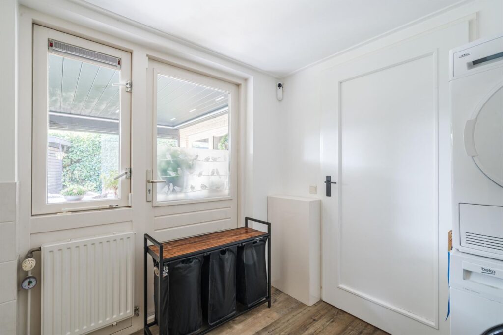 Aangrenzend aan de keuken bevindt zich een hal met witgoedopstelling van waaruit het kantoor, de berging, de kamers van de bovenverdieping en de kelder bereikbaar zijn.