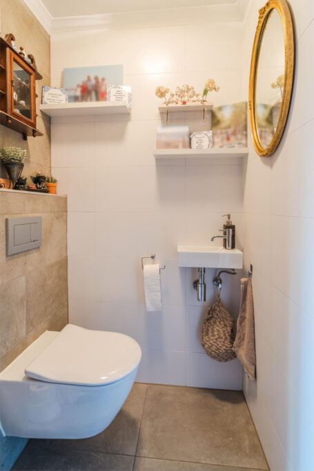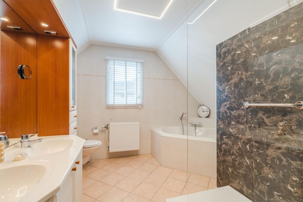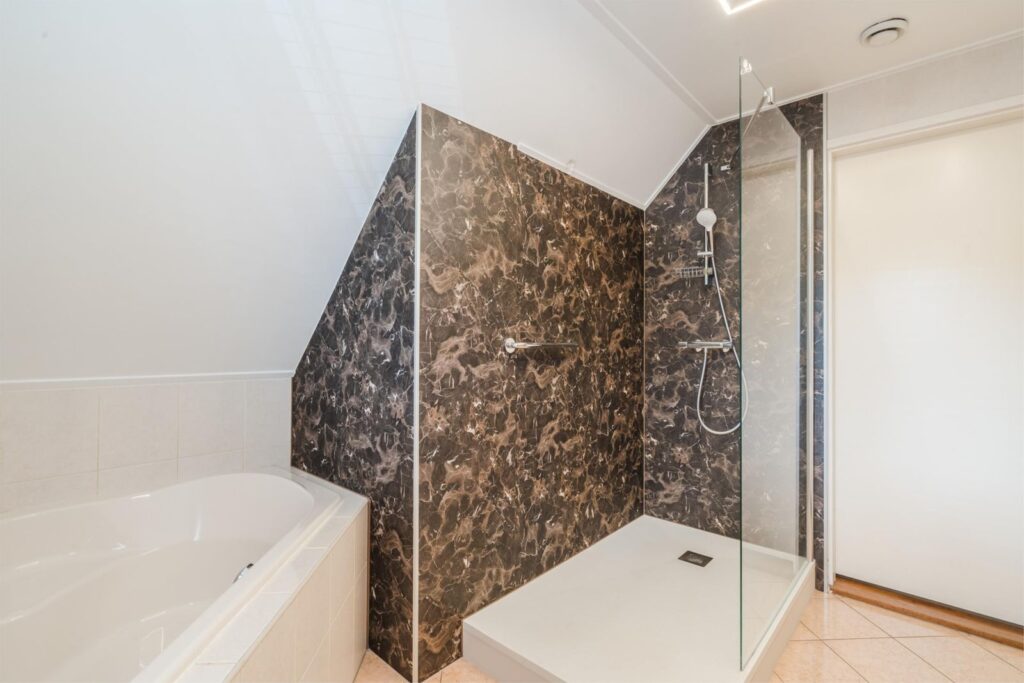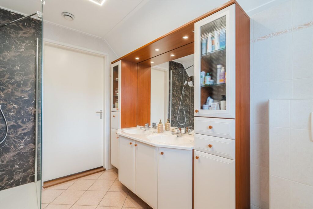 Op de overloop van het woonhuis vindt u de vlizotrap naar de vliering, een kast met de CV ketel, een ruime badkamer met inloopdouche, ligbad en wastafelmeubel met een dubbele wastafel.