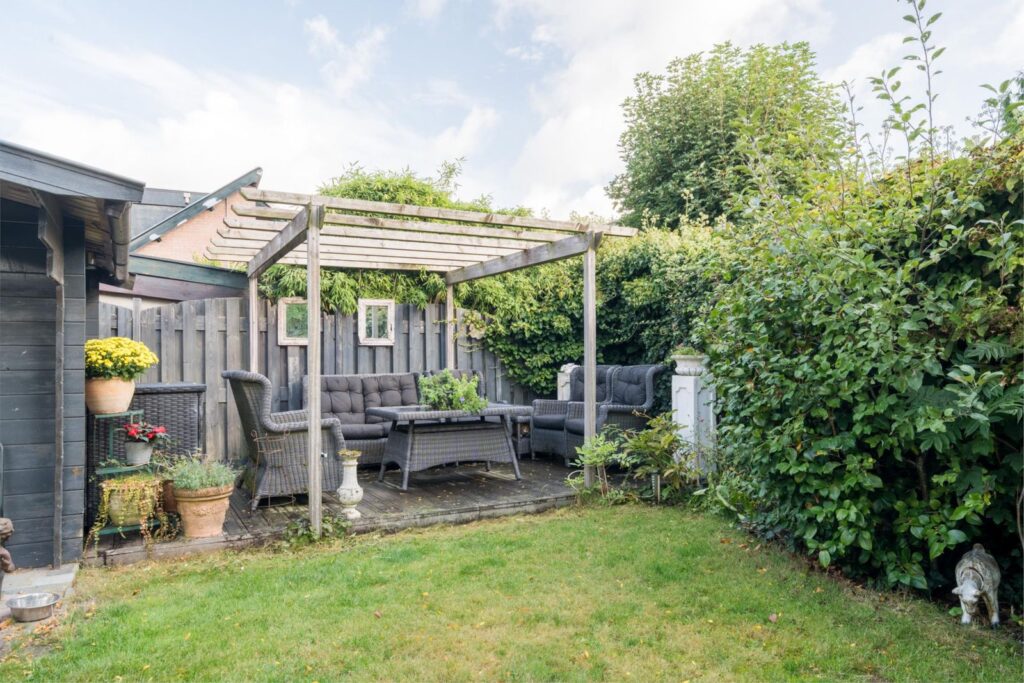De beschutte tuin biedt veel privacy en heeft verschillende fijne zitplekken.