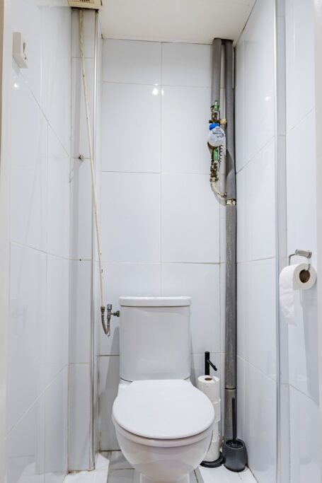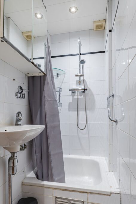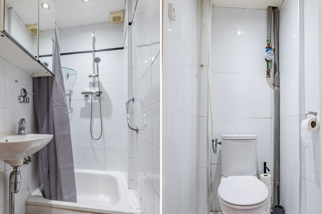 De badkamer is voorzien van een douche en wastafel. Separaat toilet aanwezig.