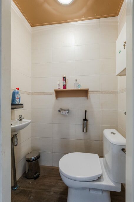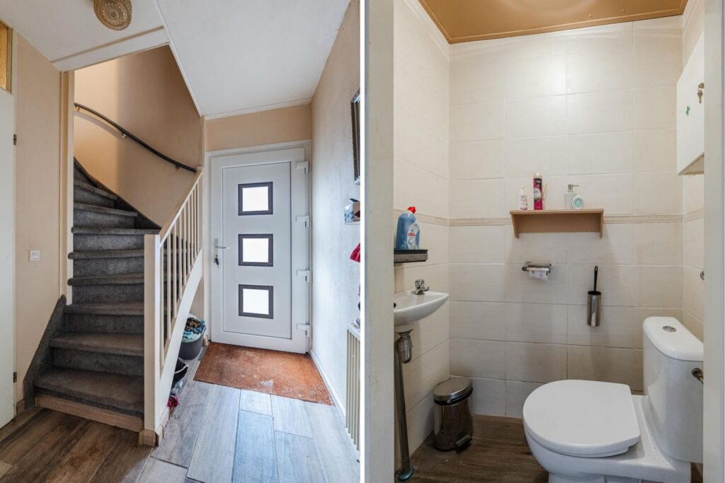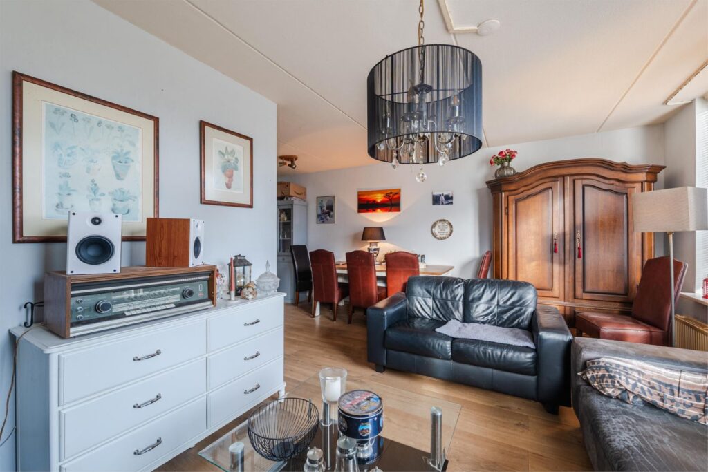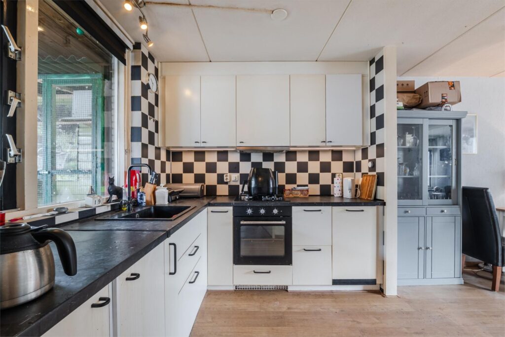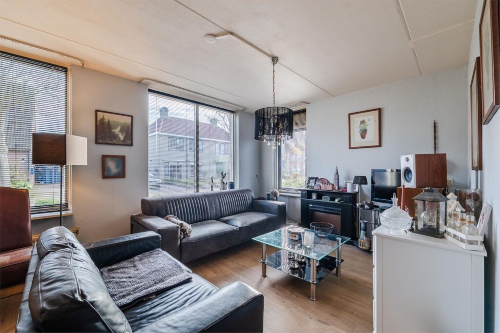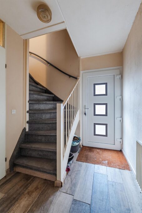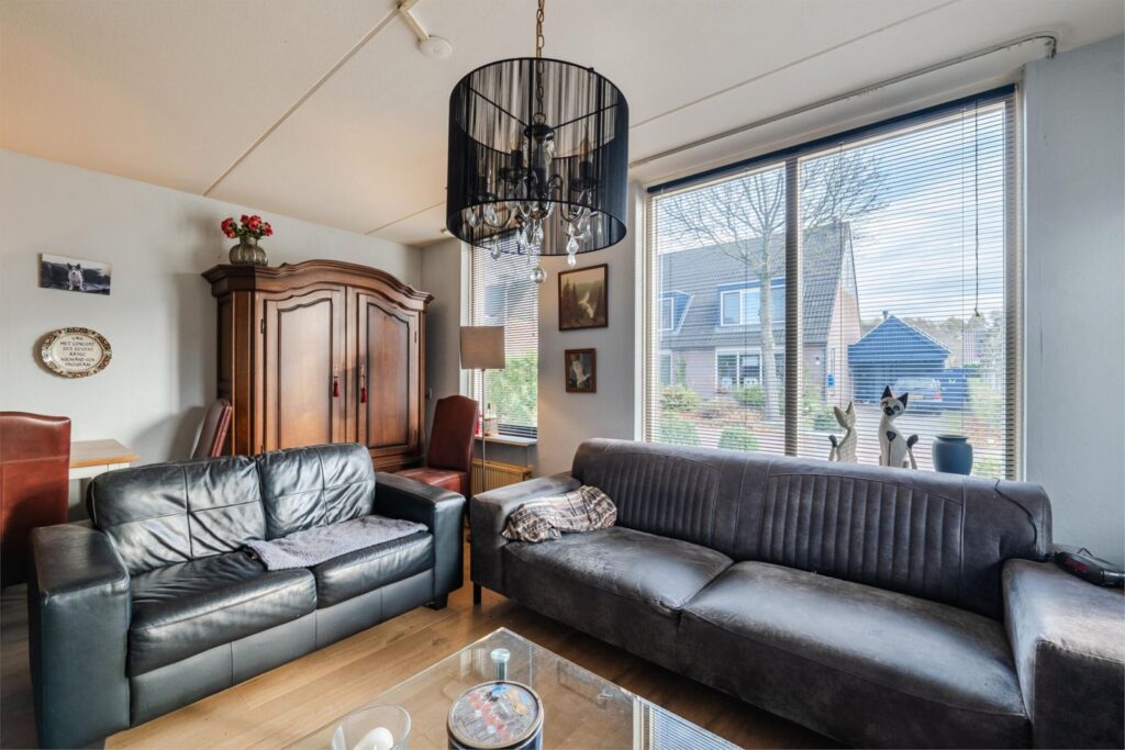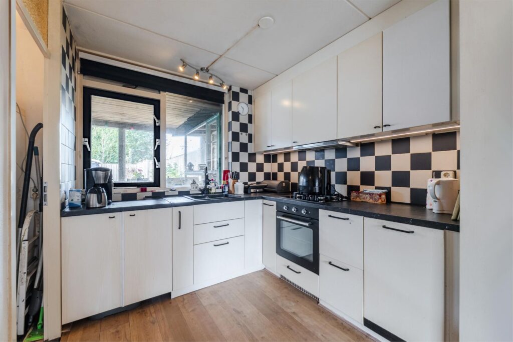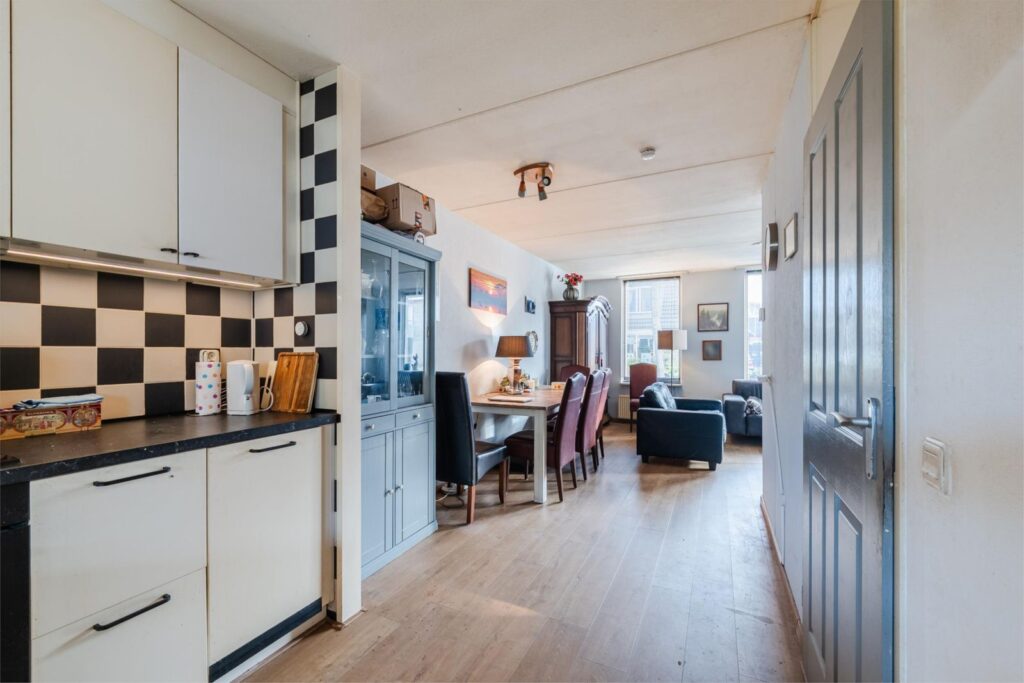 Hal/ entree voorzien van plavuizenvloer; toilet met fontein; L-vormige woonkamer met laminaatvloer; open keuken met nette inbouwkeuken voorzien van oven, 4 pits gascomfort, vaatwasser en afzuigkap; bijkeuken voorzien van plavuizenvloer, witgoedaansluiting en opstelplaats cv ketel.
