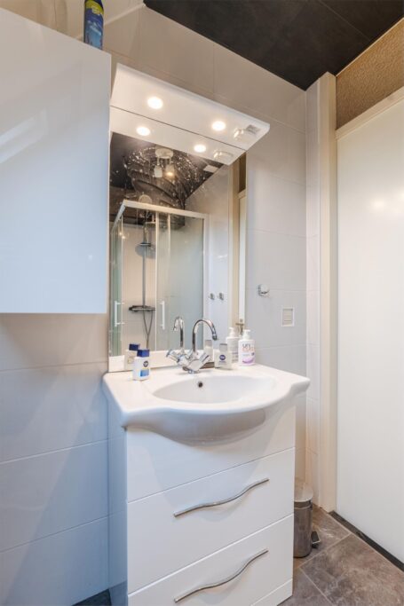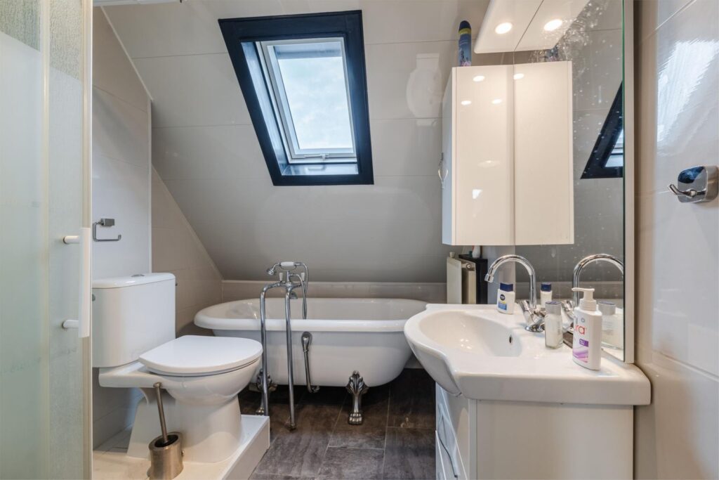 Overloop; 3 slaapkamers waarvan 2 met laminaatvloer; keurige badkamer met vrijstaand ligbad, douche, vaste wastafel en 2e toilet.