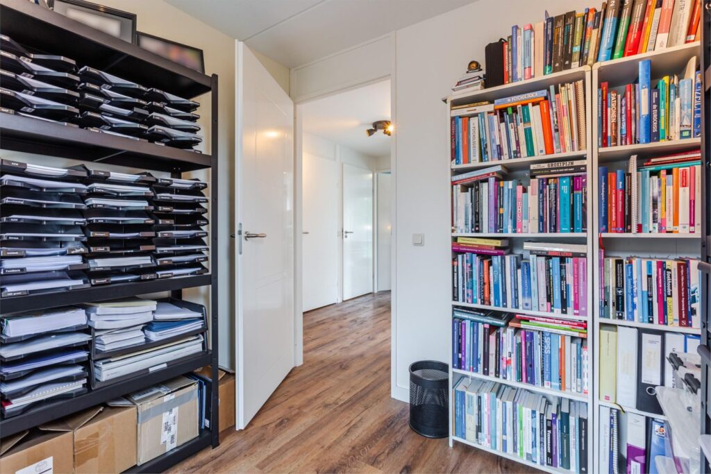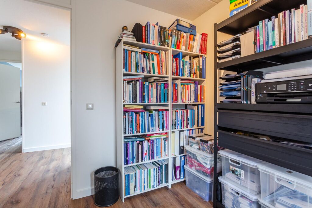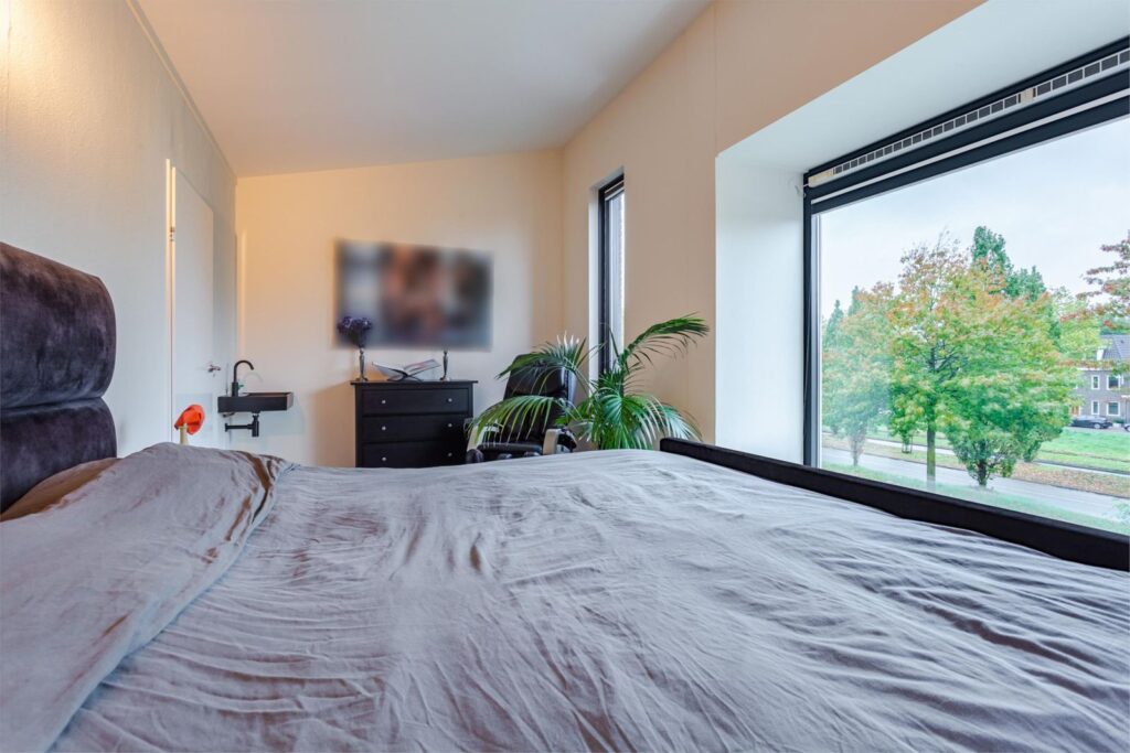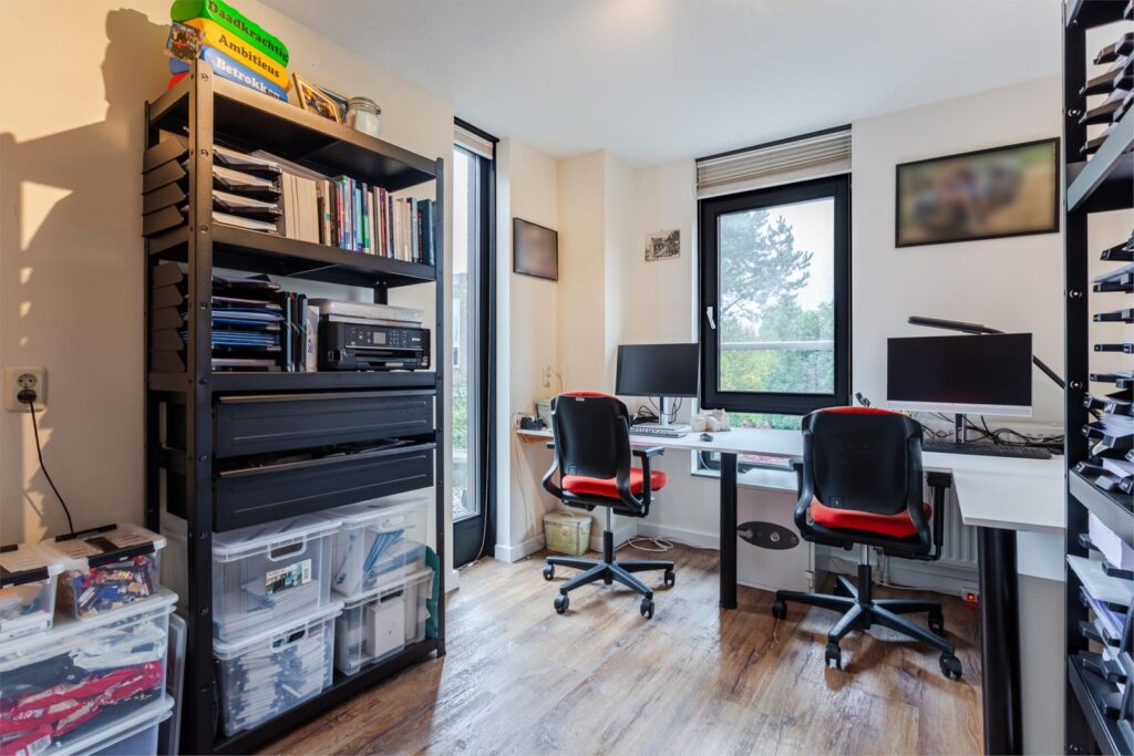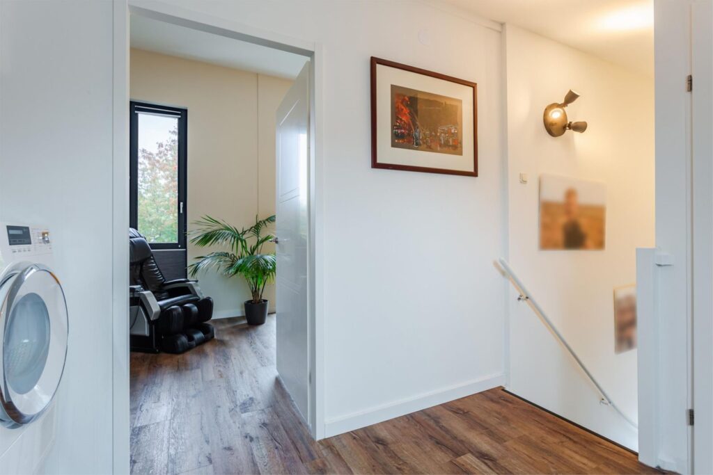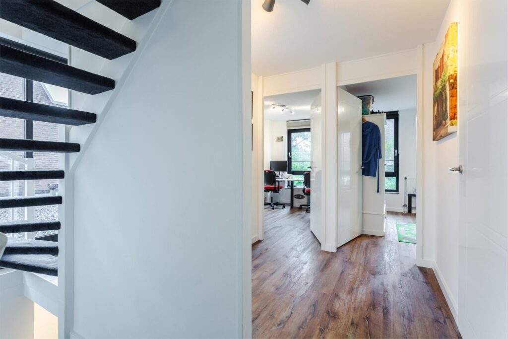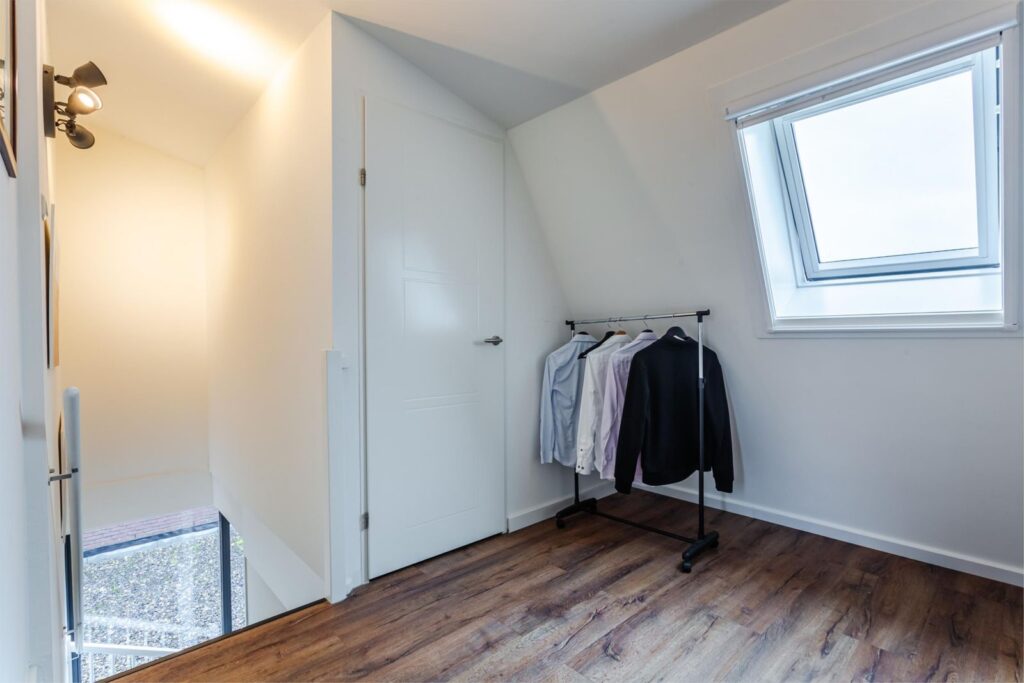 Via de grote raampartijen loop je langs het toilet op de eerste verdieping de trap op naar de bovenste verdieping. Hier bevindt zich de grootste slaapkamer met wederom veel lichtinval door de ramen aan de voorkant en zijkant. Indien gewenst kan hier nog een extra (slaap)kamer gerealiseerd worden. De airco op deze verdieping zorgt ervoor dat het klimaat aangenaam blijft, ook op warme dagen. Er is op deze verdieping een berging aanwezig waarin zich de cv-installatie en zonneboiler bevindt. Op de voorzolder is ruimte voor de wasmachine en droger. In 2025 is er aan de achterkant een dakraam geplaatst voor extra lichtinval en ventilatie.
