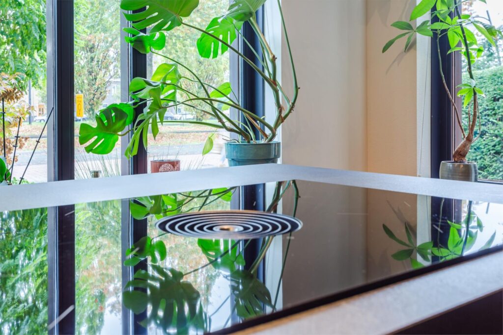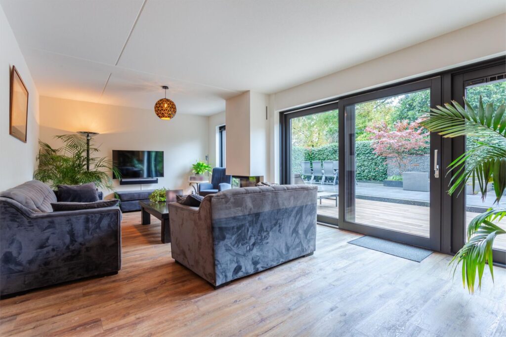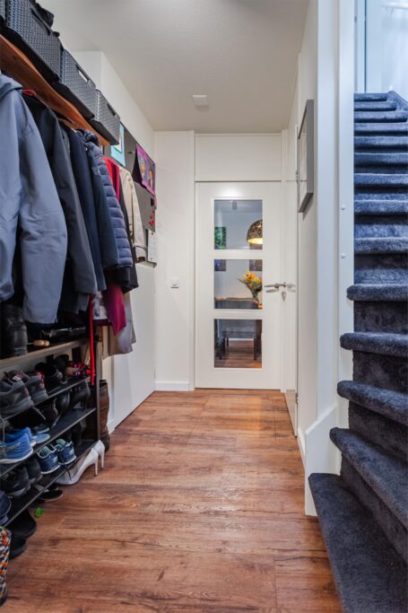 Je ziet en voelt het al als je binnenkomt: ruimte, warmte, netjes afgewerkt en onderhouden. Via de entree kan je links naar de garage en rechtsaf krijg je toegang tot de woonkamer. Je komt letterlijk in het ‘hart’ van de woonkamer binnen. Rechts een ruime keuken (uit 2021) met alle voorzieningen om te koken, een grote koelkast en aparte vriezer en een prachtig royaal kookeiland. Een plek om tijdens het koken informeel met elkaar de dag door te spreken of met het ontbijt aan de kop van het kookeiland de dag starten. Dit allemaal terwijl je naar buiten kijkt op het groen van de voortuin. Aan de achterkant van de woning vind je het zitgedeelte, hier schijnt de hele dag de zon naar binnen. Door de lichtinval en de moderne houtkachel een fijne plek in het huis om te verblijven. De gehele begane grond is voorzien van vloerverwarming. De ruimte biedt verschillende mogelijkheden voor indeling van het meubilair. In de hal bevindt zich een toilet in de zelfde stijl als de badkamer en toilet boven. Naast een voorraadkast en de meterkast krijg je ook toegang tot de trap naar boven.