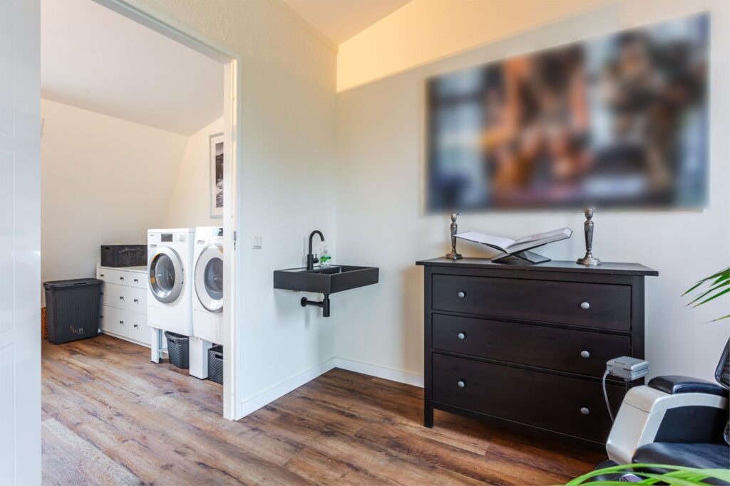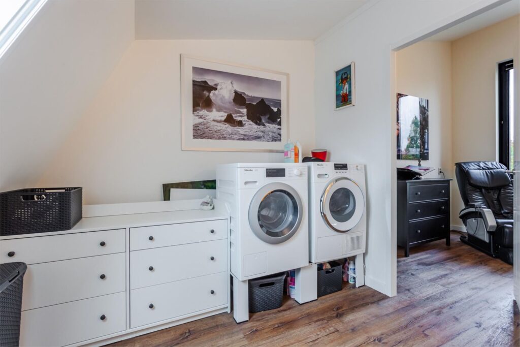 De garage heeft dubbele openslaande deuren, is goed geïsoleerd en volledig voorzien van vloerverwarming. Er is volop ruimte om spullen op te bergen en te kunnen klussen. Naast een spoelbak is er ook nog een voorziening om een wasmachine en droger te plaatsen.