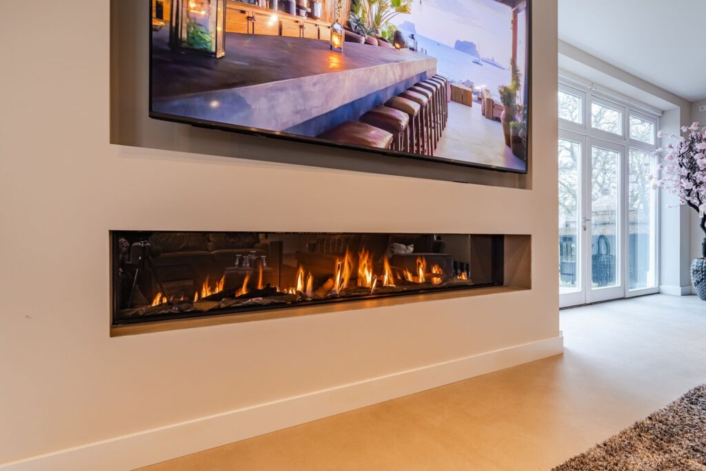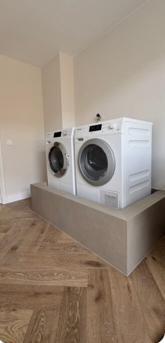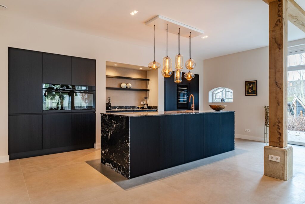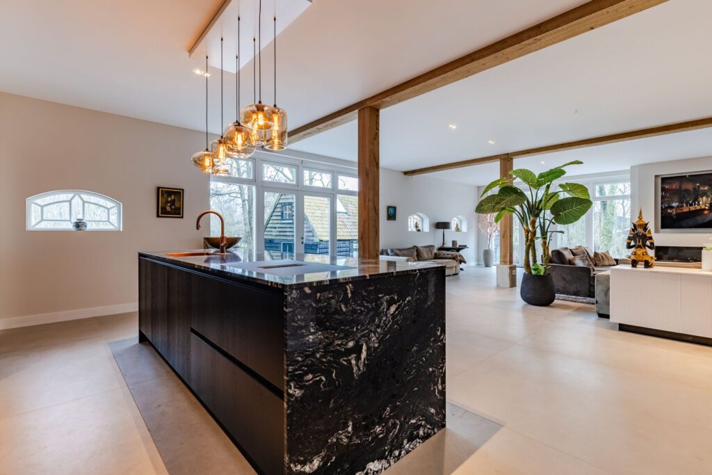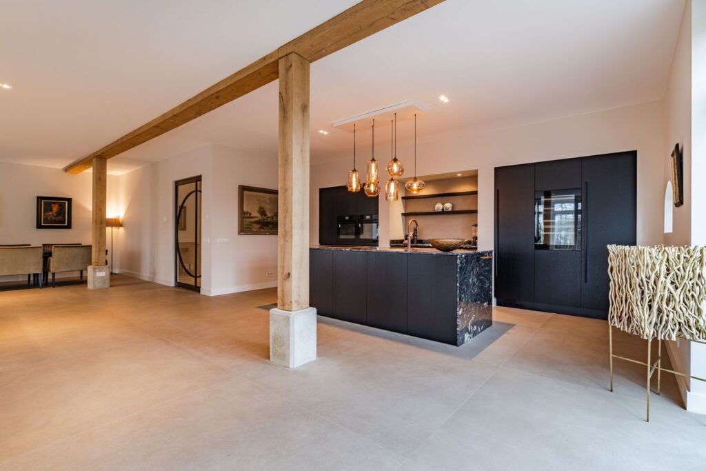 De afwerking is consequent en hoogwaardig, met onder andere grootformaat vloertegels, strak stucwerk en een maatwerk keuken met uitgebreide inbouwapparatuur.