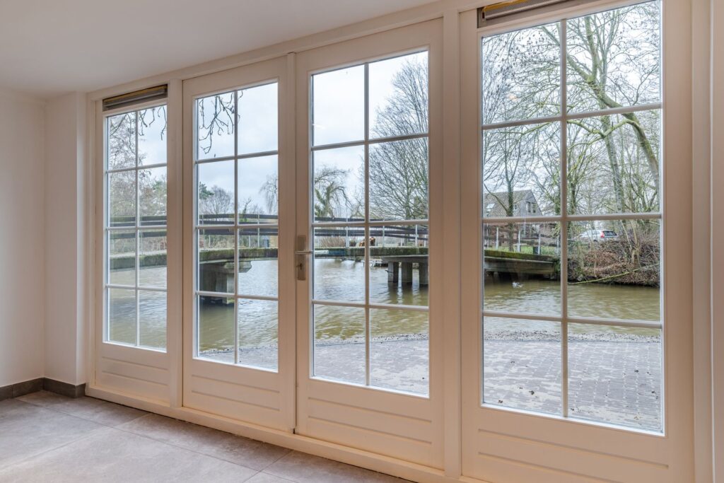 De begane grond bestaat uit één royale leefruimte met een plafondhoogte van circa 2,90 meter. Grote raampartijen en brede tuindeuren zorgen voor een sterke verbinding met de tuin en het water.