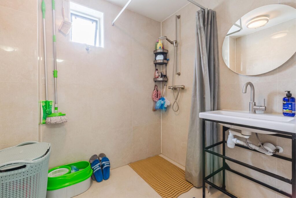 The bathroom was fully renovated in early 2024, featuring modern tiling and a washbasin.