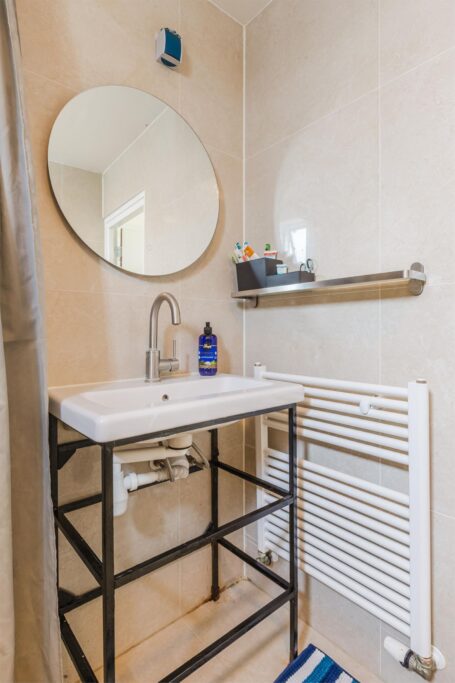 De badkamer is begin 2024 volledig vernieuwd en voorzien van moderne betegeling en een wastafel.