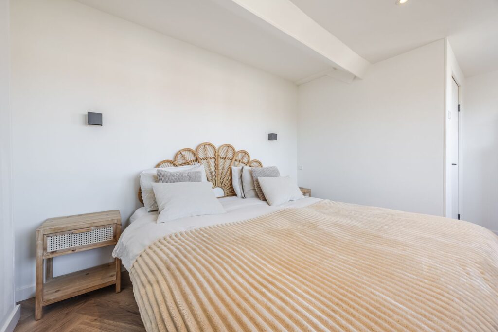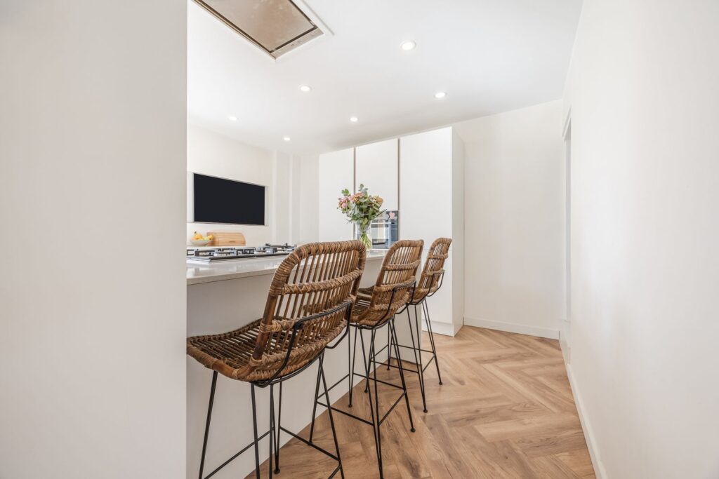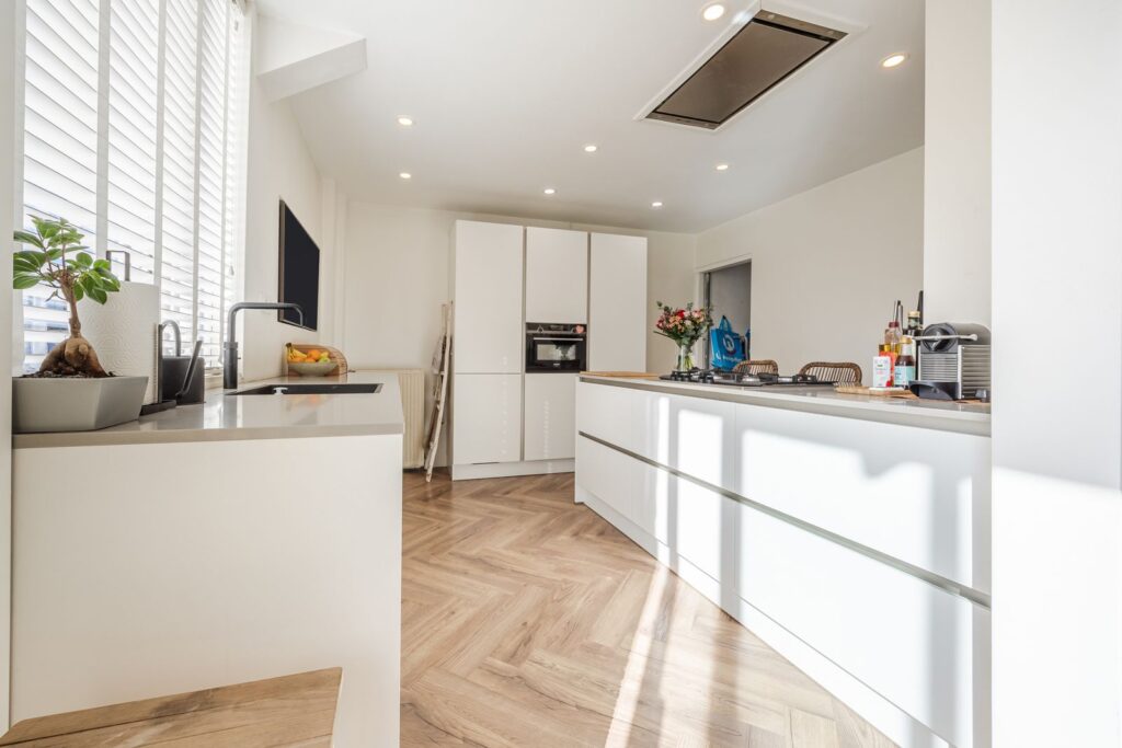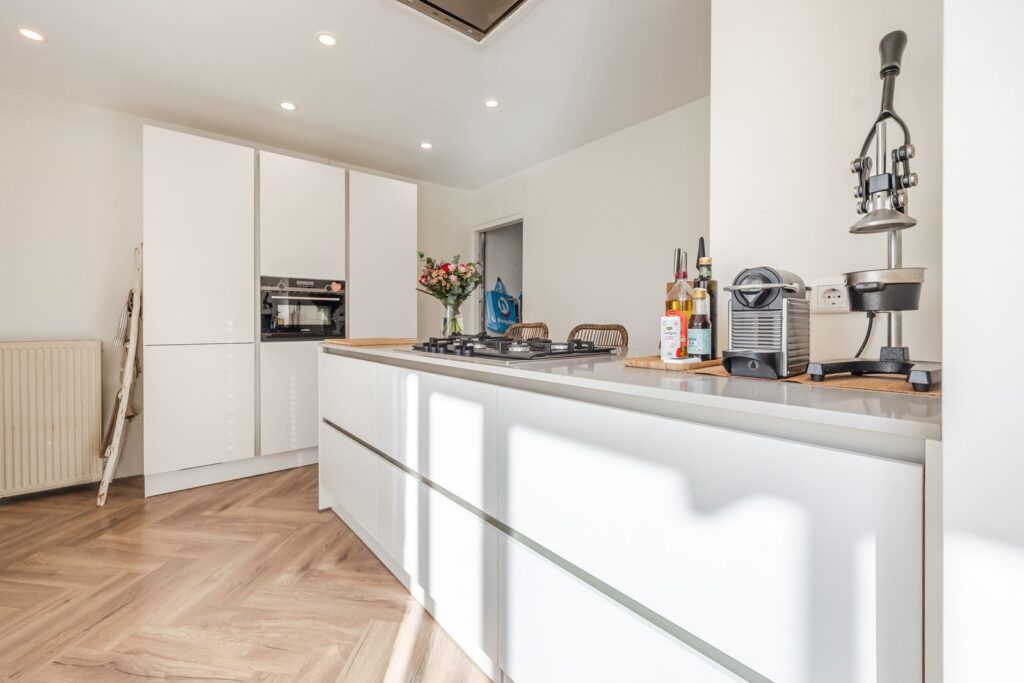 De moderne open keuken uit 2021 sluit naadloos aan op de woonkamer en is uitgevoerd in een frisse witte kleurstelling. De keuken is compleet uitgerust met onder andere een Siemens vaatwasser, combi-oven, koel-/vriescombinatie, Quooker en een vijfpits gaskookplaat.