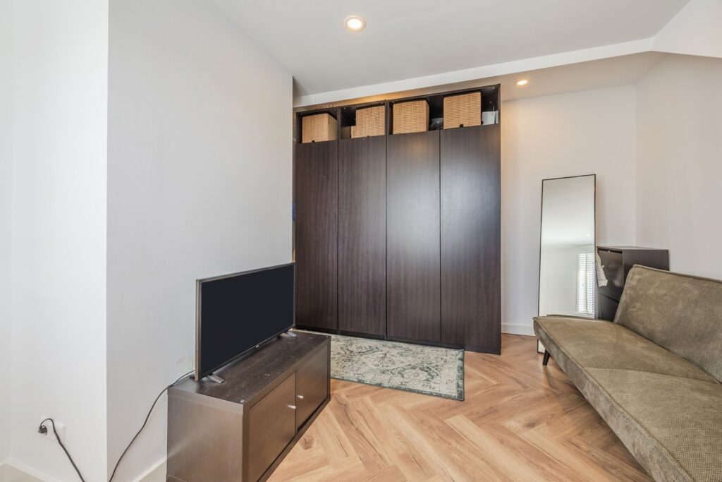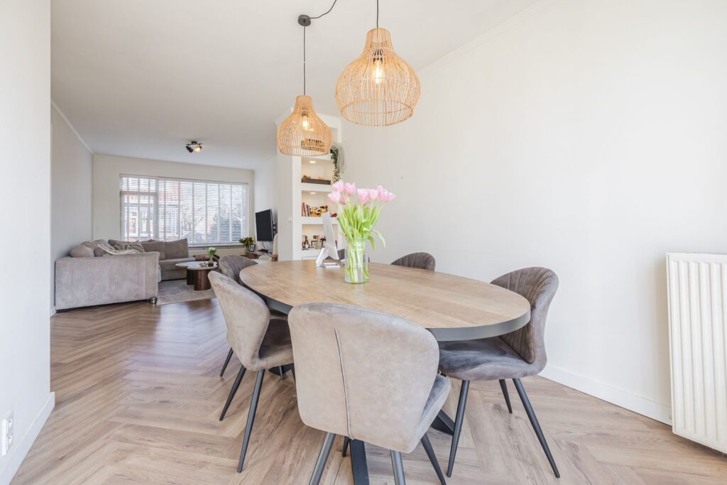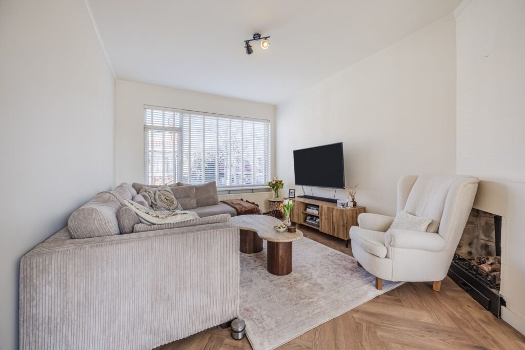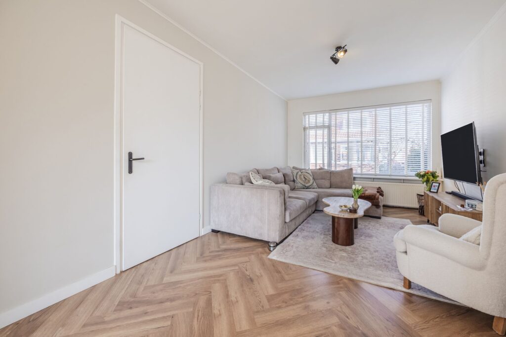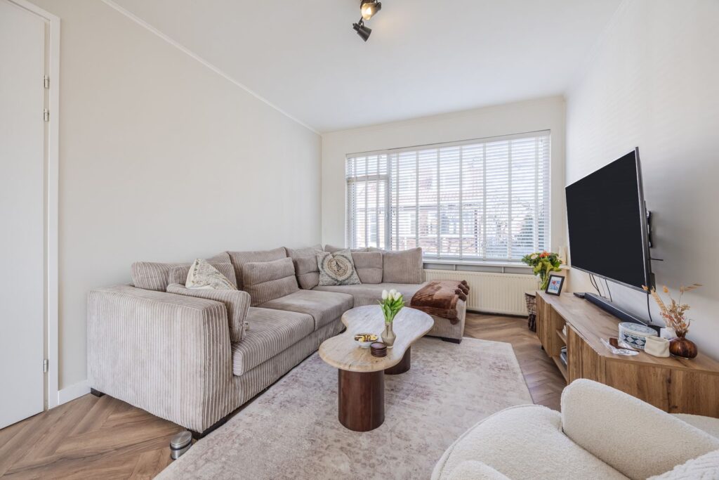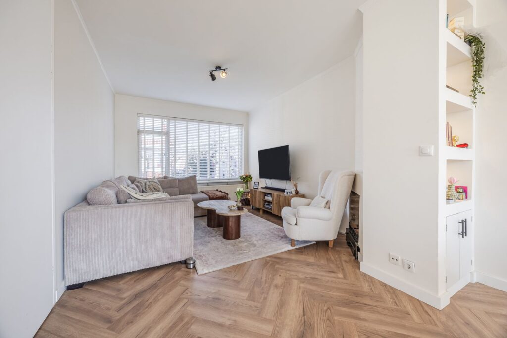 De lichte woonkamer van circa 30 m² vormt het hart van de woning. Dankzij de grote raampartijen aan de voor- en achterzijde valt het daglicht rijkelijk naar binnen en ontstaat een aangename, open sfeer. De gashaard in de schouw en de sfeervolle nisjes geven de ruimte extra karakter. Via de schuifpui bereikt u het zonnige balkon aan de achterzijde, waar u in de middag en avond heerlijk van de zon kunt genieten.