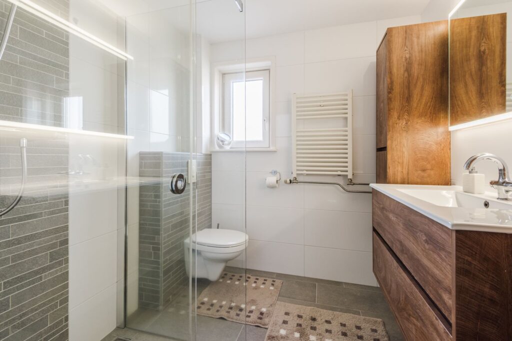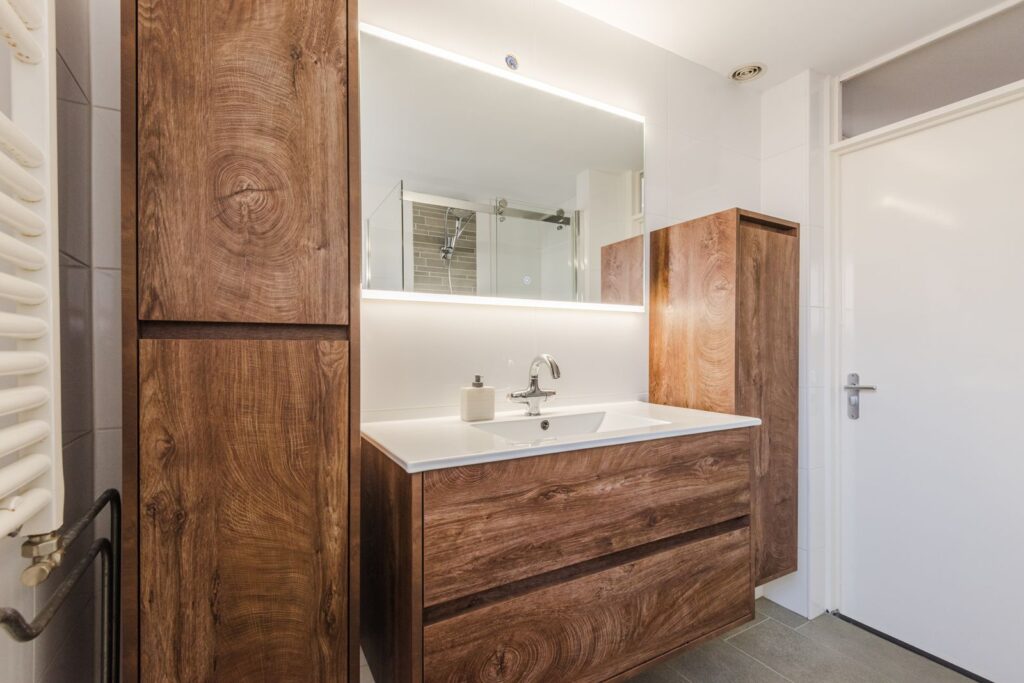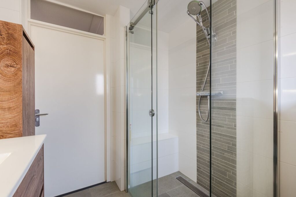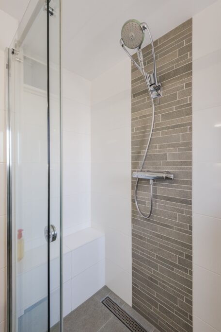 Overloop, twee riante slaapkamers en de badkamer. De badkamer is voorzien van wastafelmeubel met wastafel, toilet en douche.