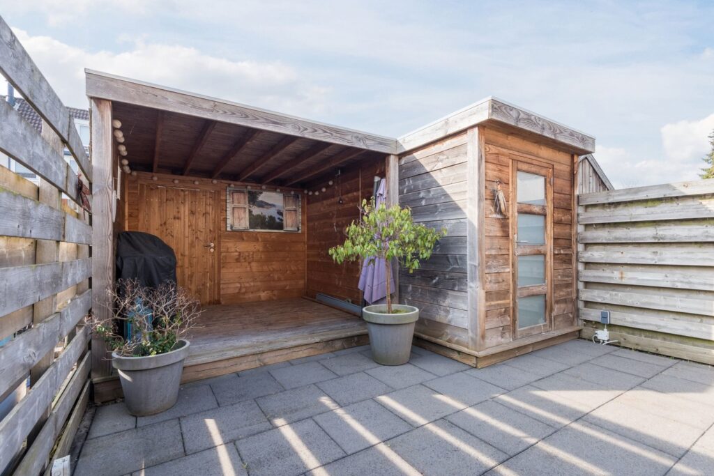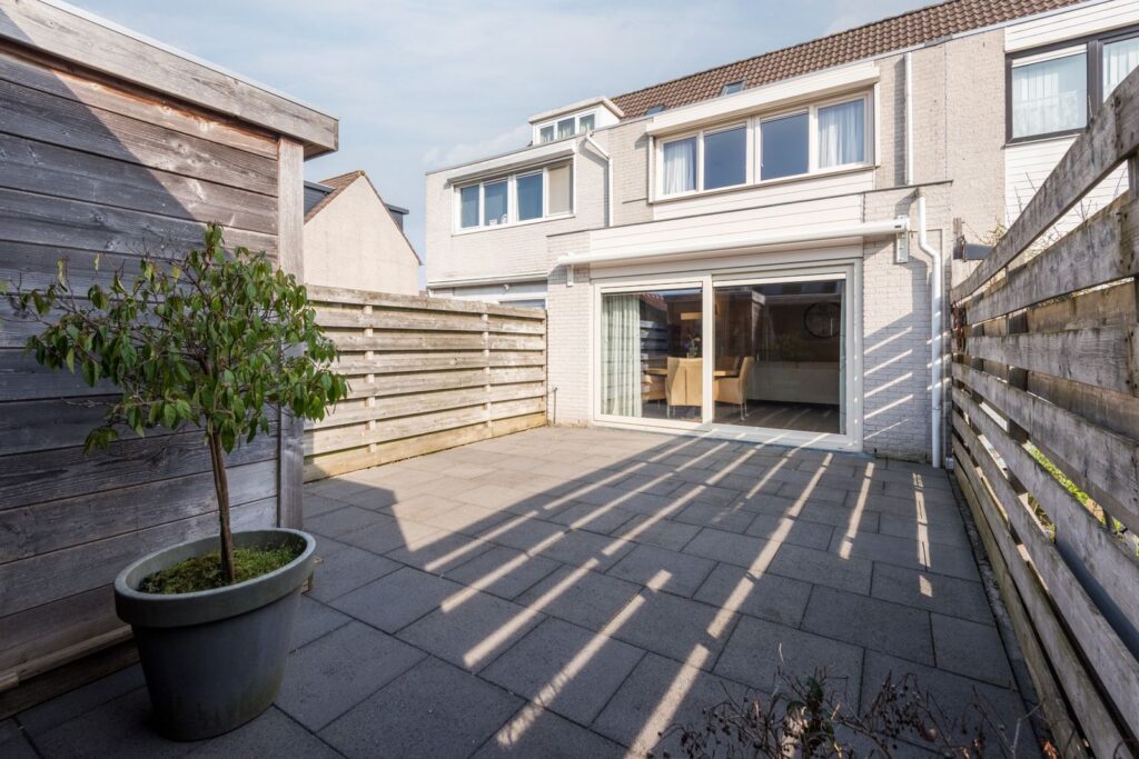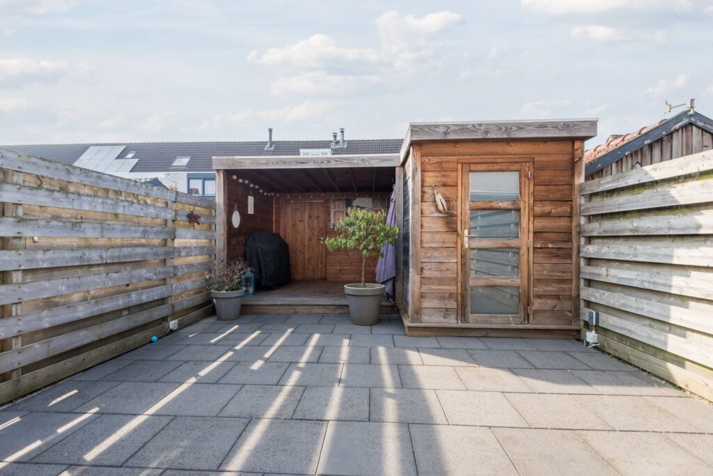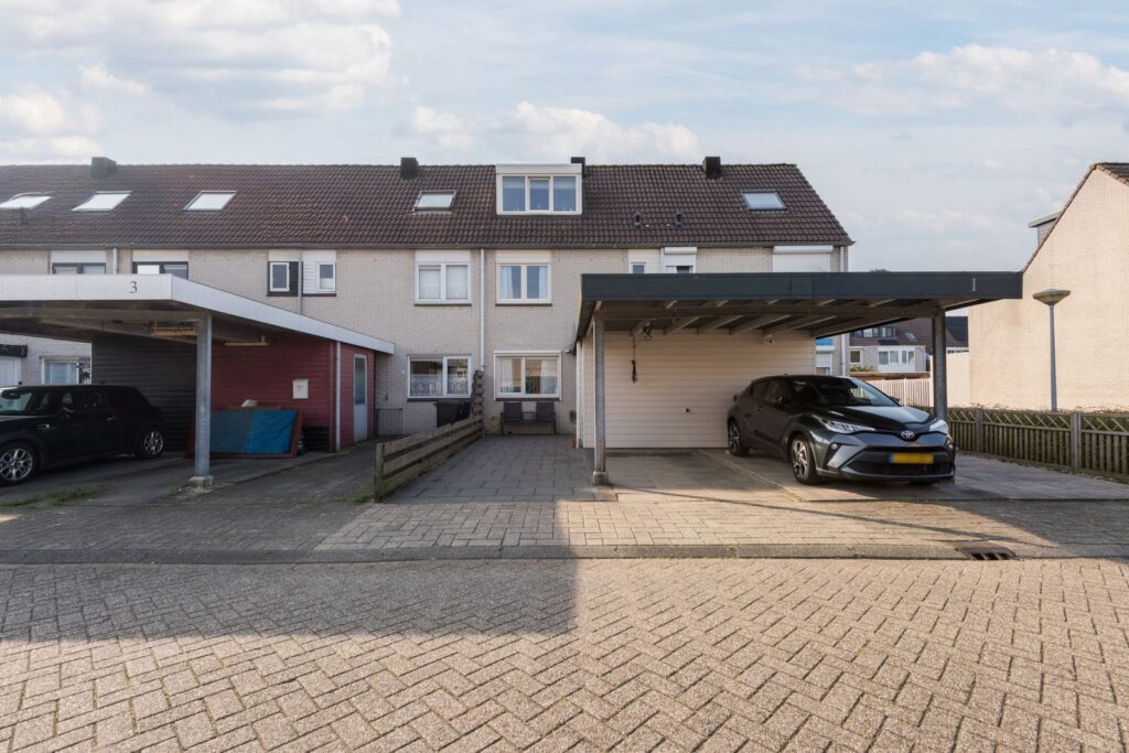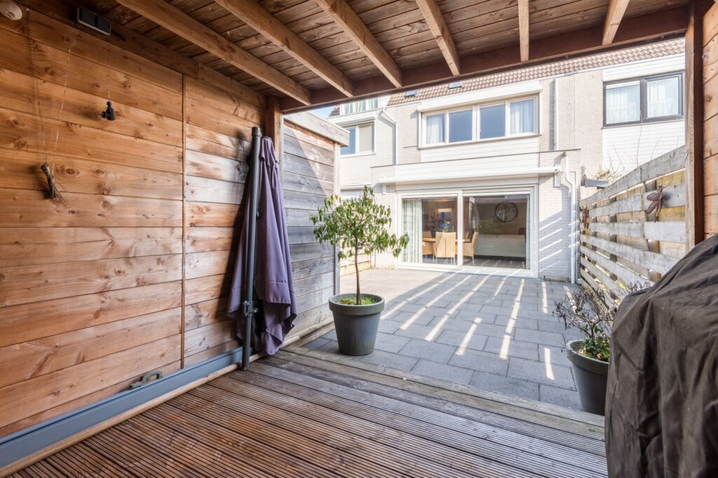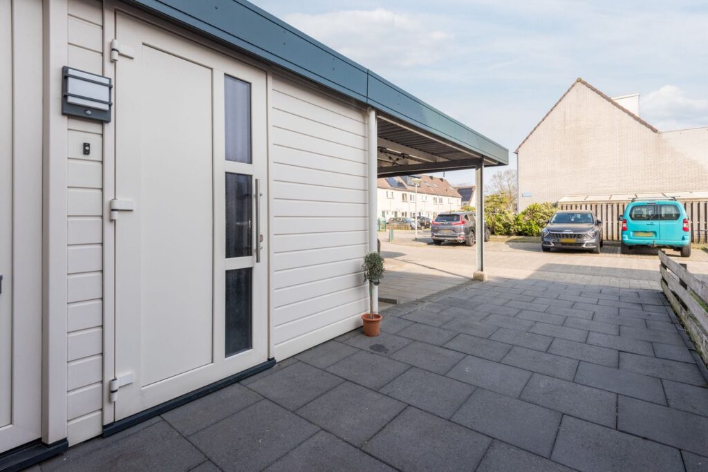 Achtertuin heeft een zonnige ligging op het westen en is voorzien van een houtenberging met een overkapping. Aan de voorzijde van de woning kan je parkeren op eigen terrein onder de carport en is er een tweede berging van kunststof.