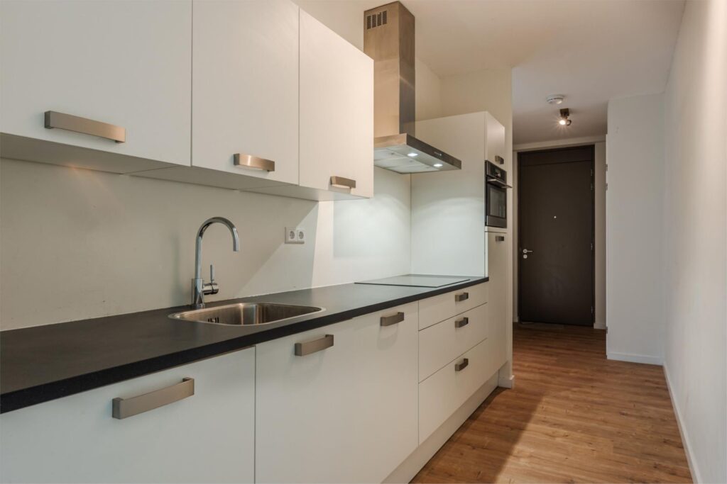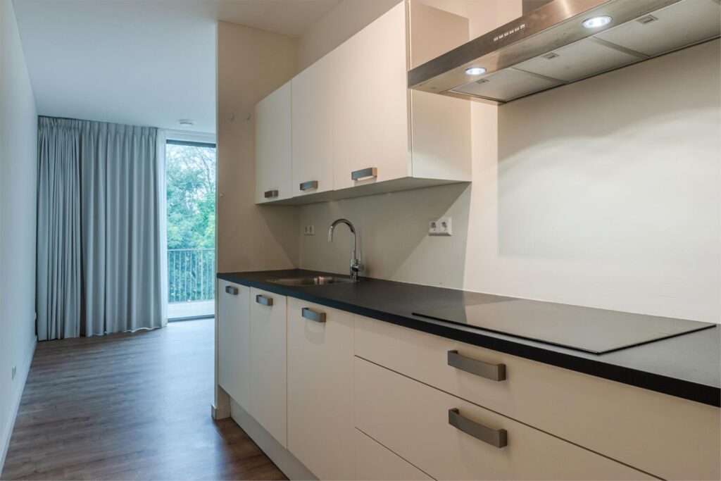 Via de hal, waar de meterkast is, stap je binnen in dit sfeervolle appartement. De ruime woonkamer (ruim 19 m2) is heerlijk licht dankzij de grote raampartijen en biedt toegang tot het heerlijke terras (8,30 m2), waar je kunt genieten van het buitenleven en uitzicht op het groen. De open keuken (6,19 m2) sluit hier mooi op aan en is praktisch ingericht met voldoende werk- en opbergruimte. In de keuken is een inductiekookplaat, een koelkast (er is een separate vriezer in bergruimte) een combi-oven en een vaatwasser.