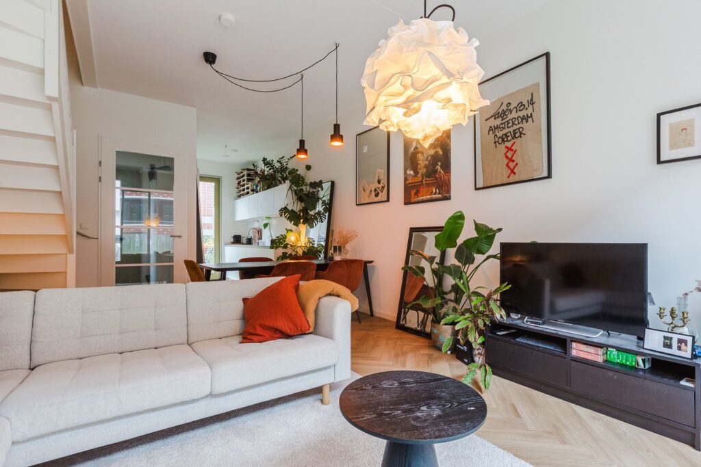 At the rear of the house lies the bright and atmospheric living room with large sliding glass doors opening directly onto the water—an exceptional feature in Amsterdam. From morning to evening you can enjoy the view of the shimmering water, the passing ferry, and boats gliding by. There is also the option to moor a small boat or sloop, and installing a jetty would create approximately 6 m² of additional outdoor space.