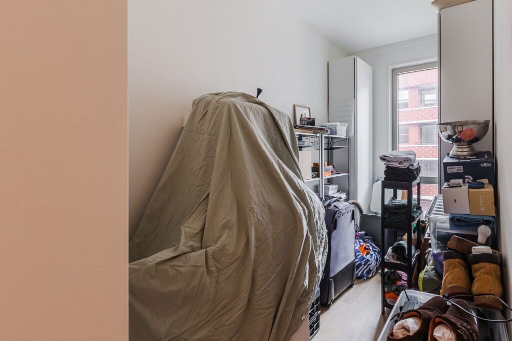 The modern bathroom is beautifully finished with a spacious walk-in shower and a stylish washbasin cabinet. There is also a separate toilet and a practical storage room with space for a washing machine and dryer, along with extra storage. The entire apartment is equipped with underfloor heating and cooling.