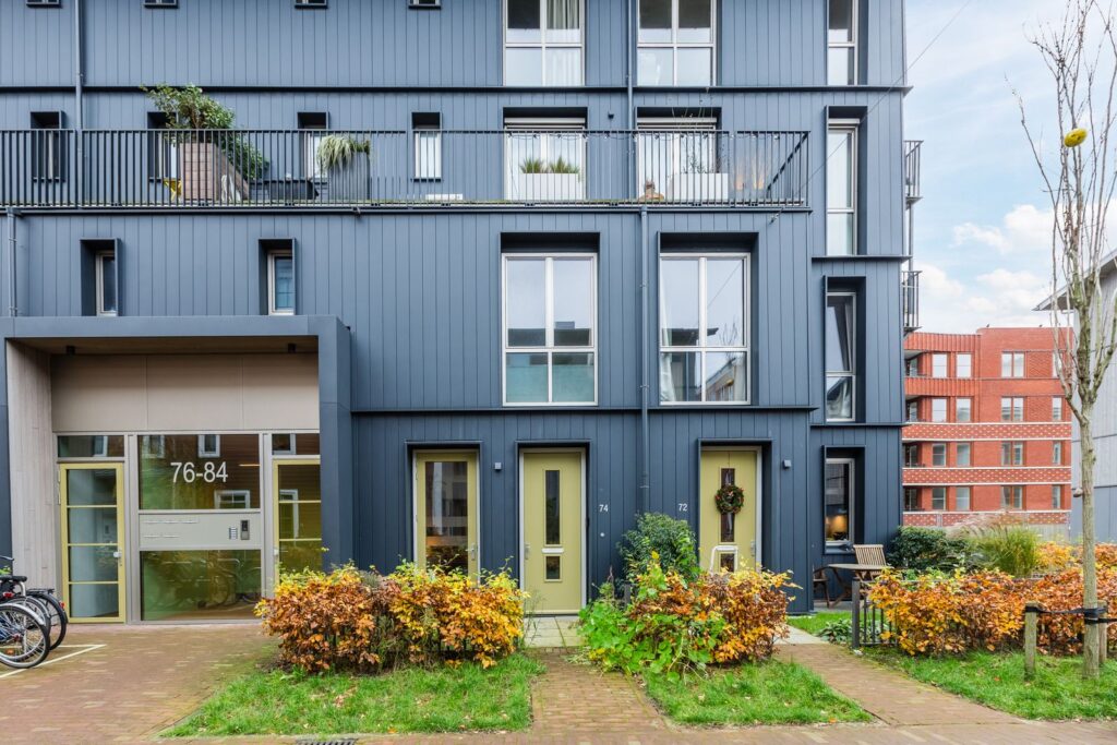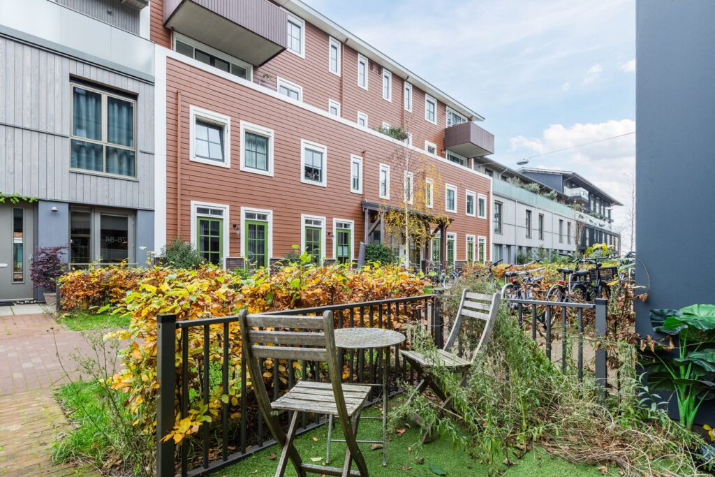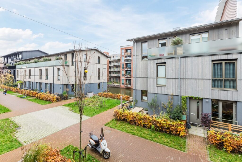 Libau Island is inspired by the historic timber warehouses that once defined the Houthaven area. Wooden façades, sloping roofs, and natural grey and brown tones echo the neighbourhood’s industrial past, while creating a warm and tranquil atmosphere. The streets feel intimate yet offer wide, expansive views over the water and sky. Living on Libau Island means enjoying a small-scale neighbourhood with a distinctly urban character. In summer, residents can fully embrace the watery surroundings—swimming and paddleboarding straight from the street, a rarity in Amsterdam.