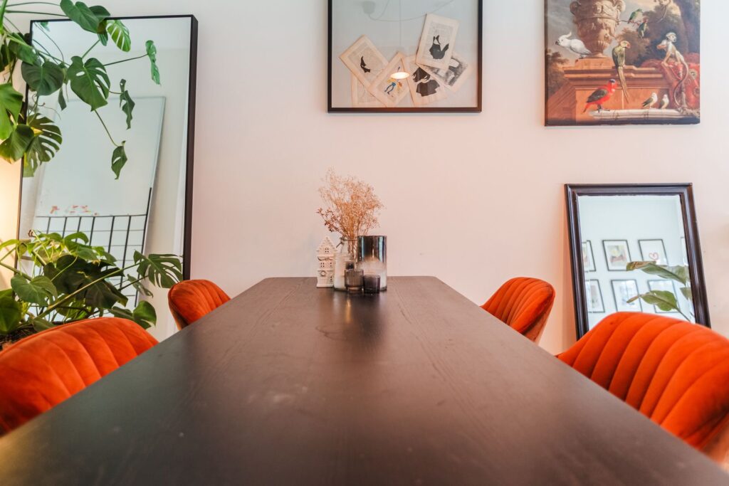 Tussen de zithoek en de keuken is ruimte voor een grote eettafel, de ideale plek om met vrienden en familie te eten en te borrelen. De keuken bevindt zich aan de voorzijde van de woning en is uitgerust met een moderne inrichting, voorzien van een BORA-kookplaat, vaatwasser, combi-oven en koel-vriescombinatie. Vanuit de keuken heb je toegang tot de tuin, een fijne connectie met buiten.