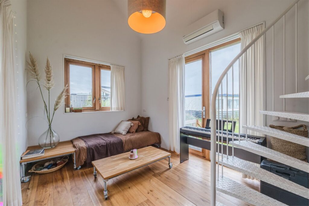 De wooneenheden zijn in 2022 biobased gebouwd in houtskeletbouw. De huisdelen staan stevig op 80 cm boven de grond uit stekende stalen palen gevuld met beton. Dak en dakgoten zijn van staal en de isolatie is van houtwol. Heel prettig is de natuurlijk vergrijzende onderhoudsvrije gevelbekleding van thermisch gemodificeerd Europees naaldhout. Ramen en kozijnen zijn ook gemaakt van onderhoudsvrij thermisch gemodificeerd Europees naaldhout en geven een mooi zicht op de tuinen rondom. De ventilatieroosters en het A+++ glas zorgen voor een prettig binnenklimaat. Het hoge plafond in de kamer geeft een ruimtelijk gevoel. De moderne badkamer is voorzien van toilet, vaste wastafel en inloopdouche. De ruime vliering ( 9 m2) met dakraam is te bereiken met een stalen wenteltrap en te gebruiken als werkruimte, slaapkamer of opslagruimte.