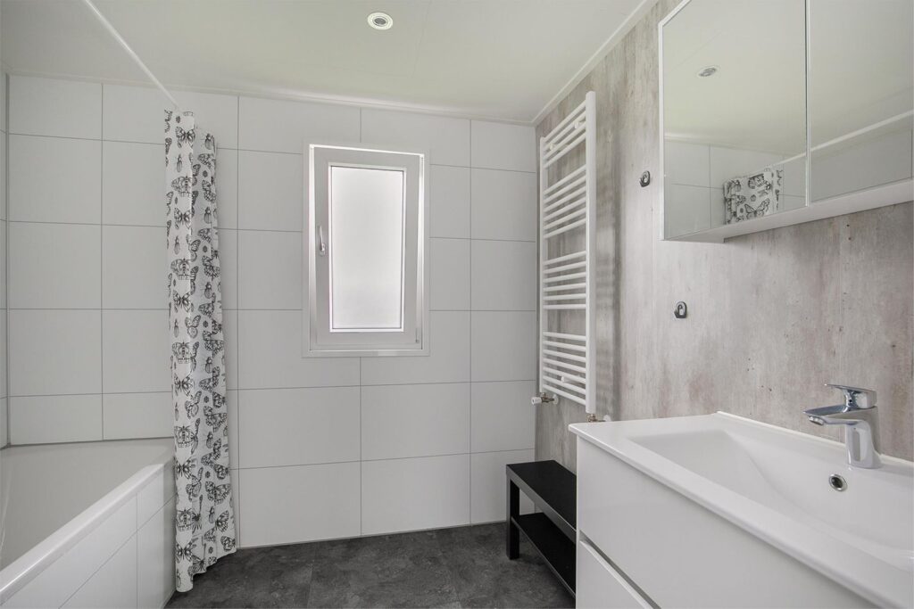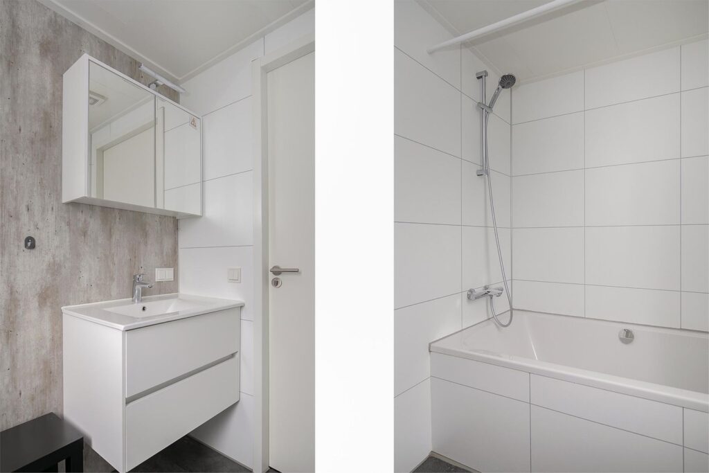 De zeer ruime badkamer is voorzien van een ruim ligbad met douchefunctie, een lichte design radiator, een luxe wastafelmeubel met lades en een opbergkastje met spiegel. Tevens is hier een raam met draai-kiepfunctie alsmede mechanische ventilatie. In het toilet is ook mechanische ventilatie en een fonteintje.