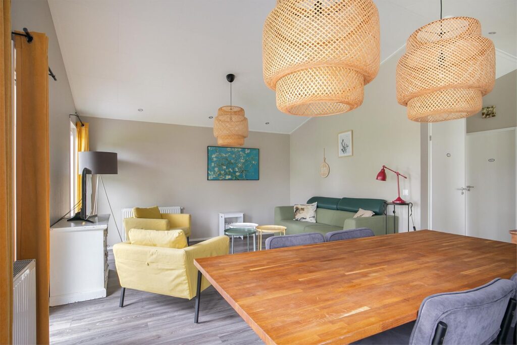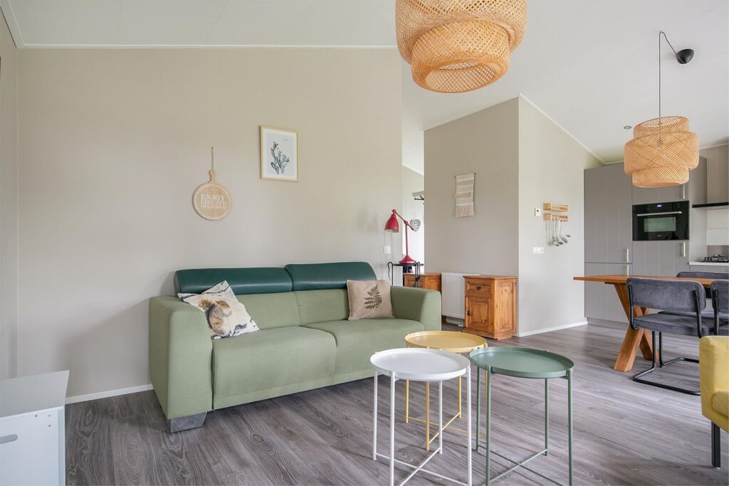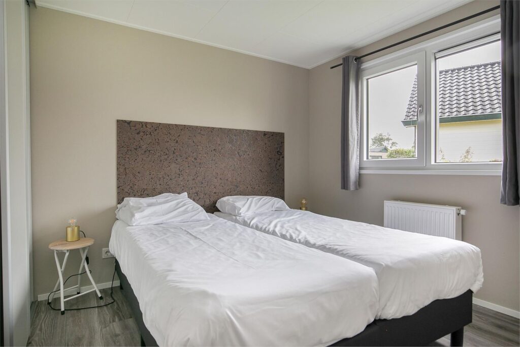 Deze ruime rustig gelegen vakantiewoning aan het begin van het park (dichtbij de slagboom en de algemene parkeerplaatsen waar uw bezoek parkeert en ook bij de receptie en het verwarmde zwembad en wasserette).