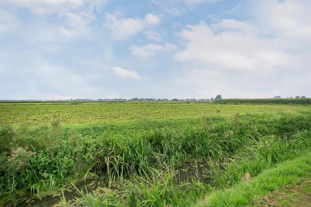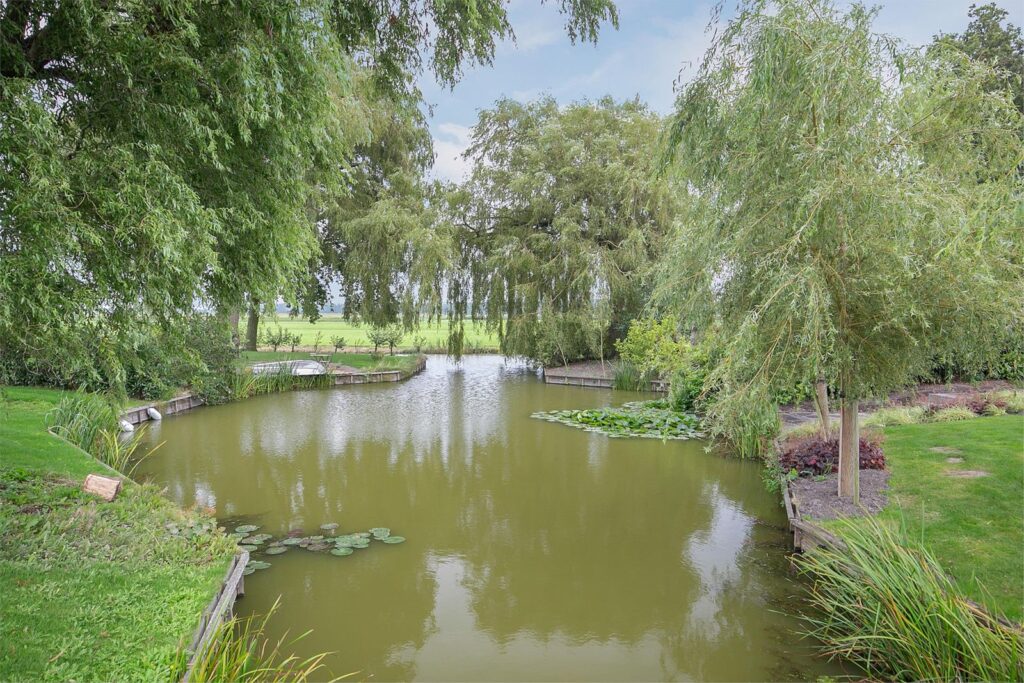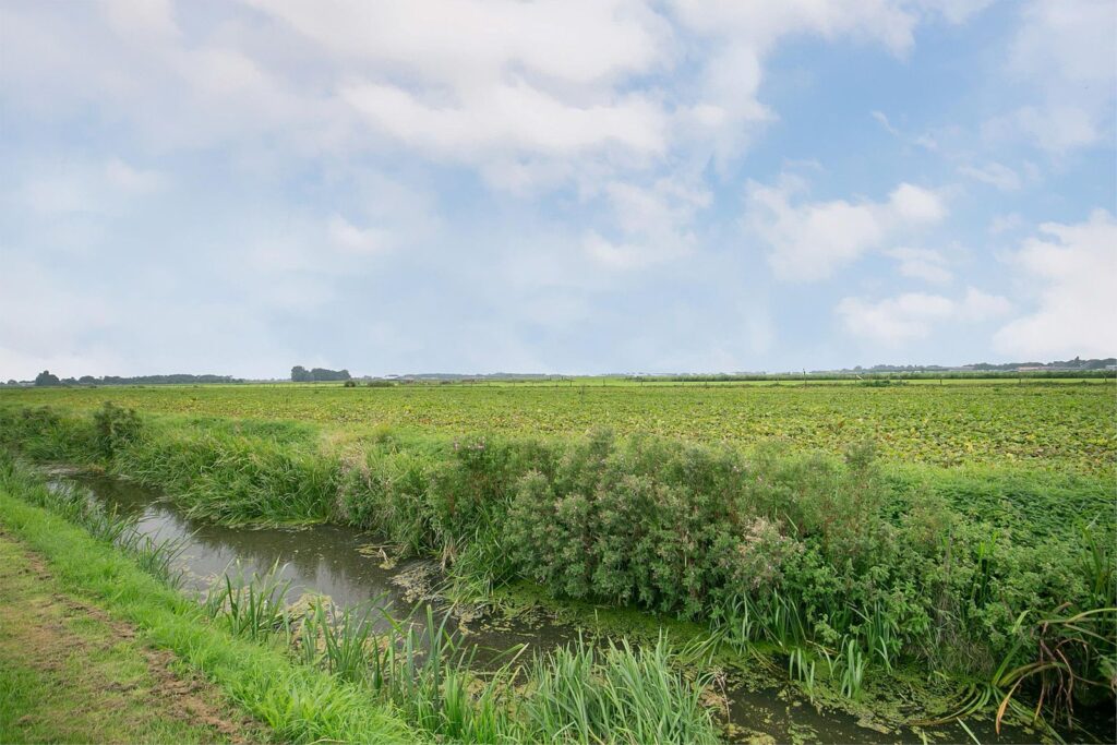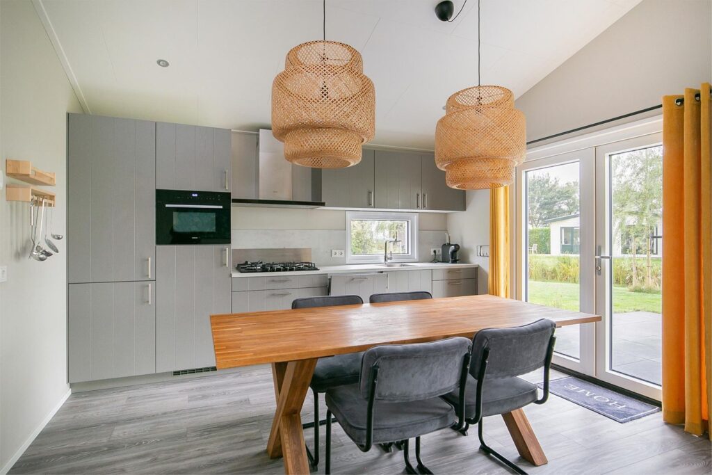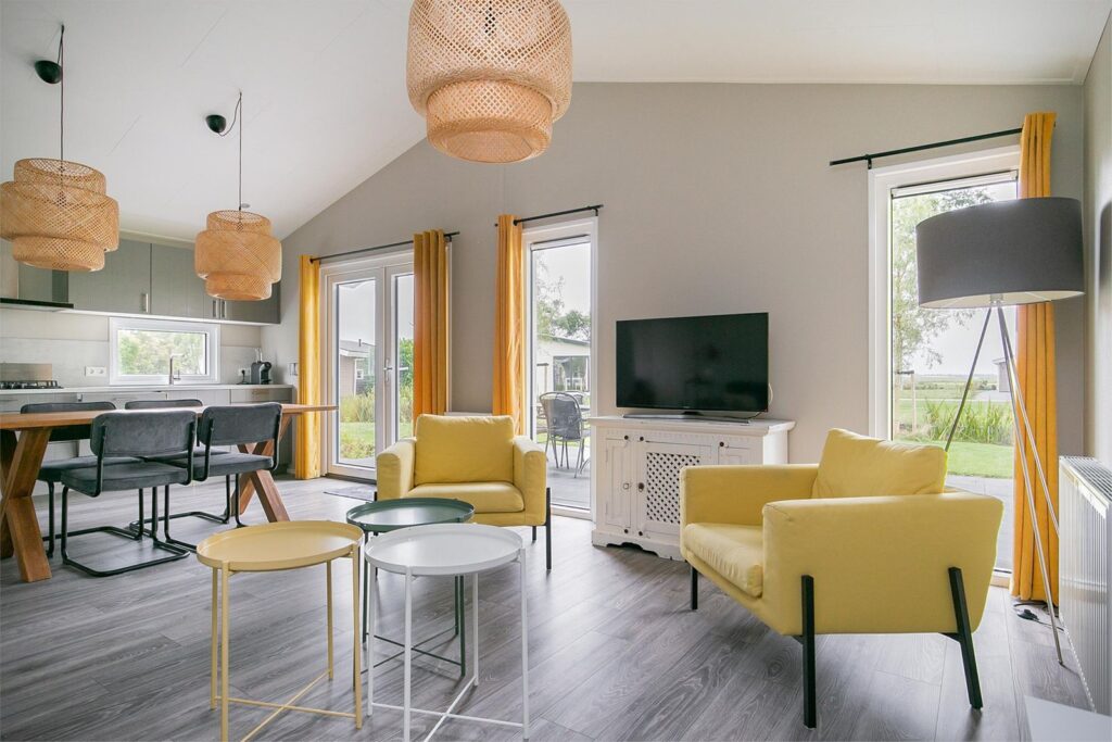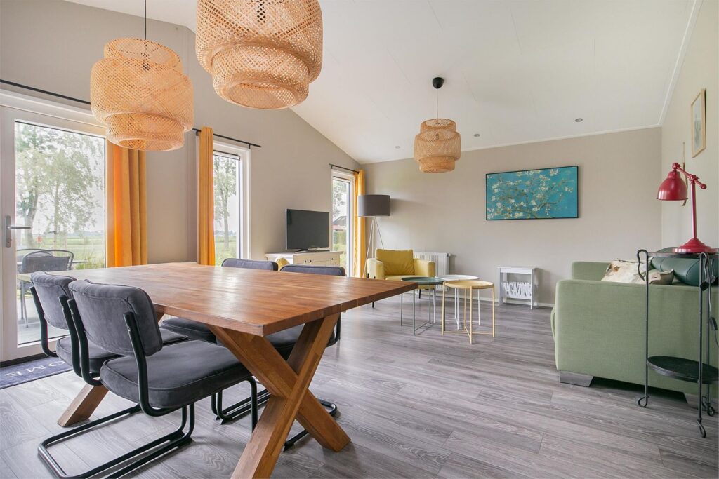 De woonkamer is voorzien van een mooi hoog plafond en dit geeft een ruimtelijk gevoel. U kijkt door de vele ramen en openslaande deuren naar de tuin naar de landelijke groene omgeving en u kunt van de watervogels in de aangrenzende sloot genieten. U kunt hier ook vissen of varen en doordat de tuin zo ruim is zit u niet te dicht op de buren. Er is een tv- en internetaansluiting aanwezig. Vanuit de keuken stapt u door de openslaande deuren het terras op waar U van de zon kunt genieten! Er zijn uittrekbare windschermen geplaatst zodat u beschutting heeft tegen de wind en privacy geniet.