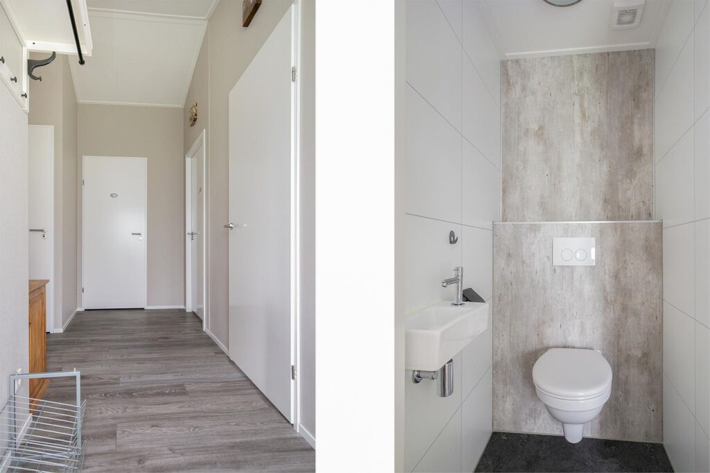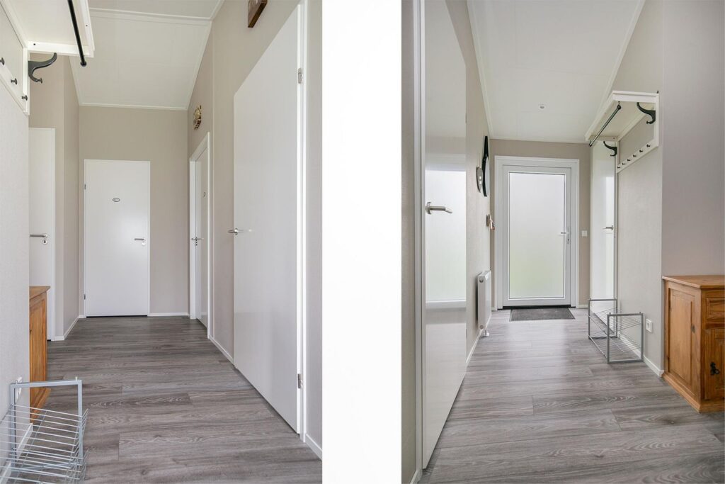 Binnen heeft u alle ruimtes gelijkvloers dus geschikt voor alle leeftijden en minder validen. Als u binnenkomt vind u aan uw linkerhand een slaapkamer die nu dienstdoet als bergruimte voor een vriezer een linnenkast en kapstokken.