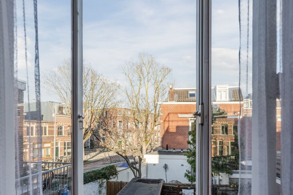 Via de trap bereik je de eerste verdieping, waar zich drie slaapkamers bevinden. Dankzij de ligging aan de voorzijde geniet je van een bijzonder uitzicht over de Adelaarstraat met zicht op de Utrechtse molen — een typisch stadsbeeld met karakter.