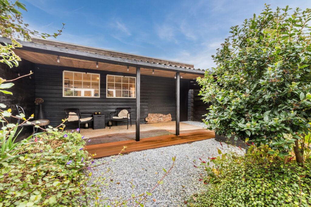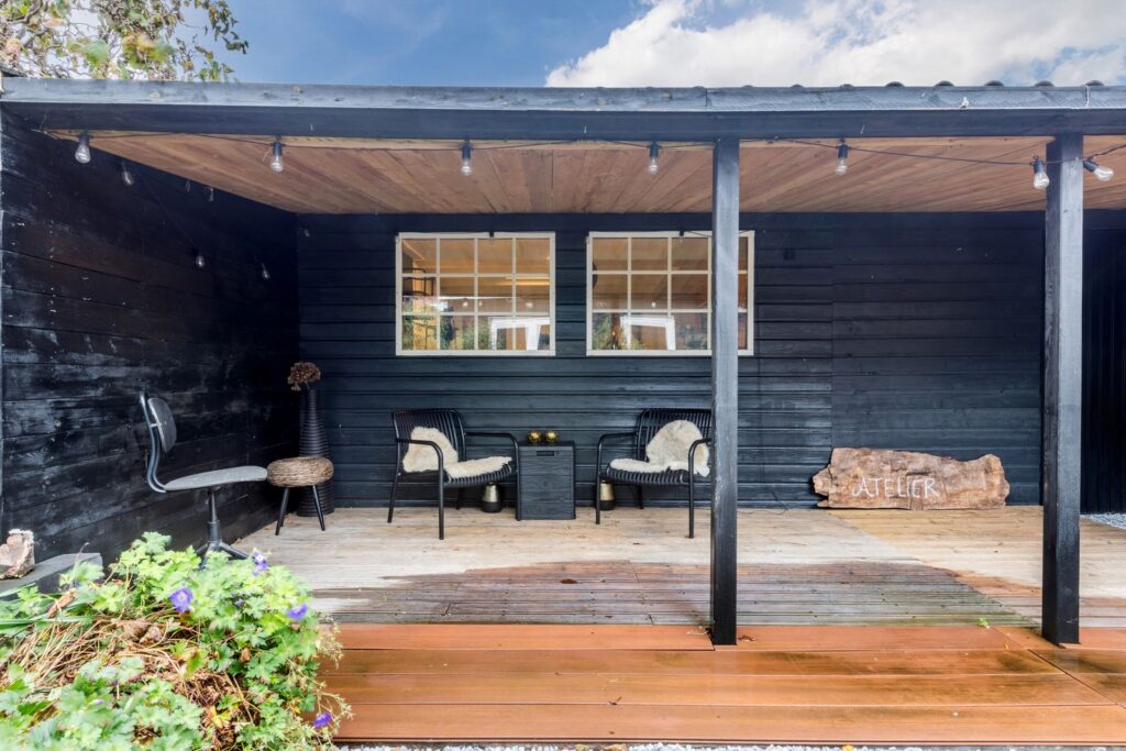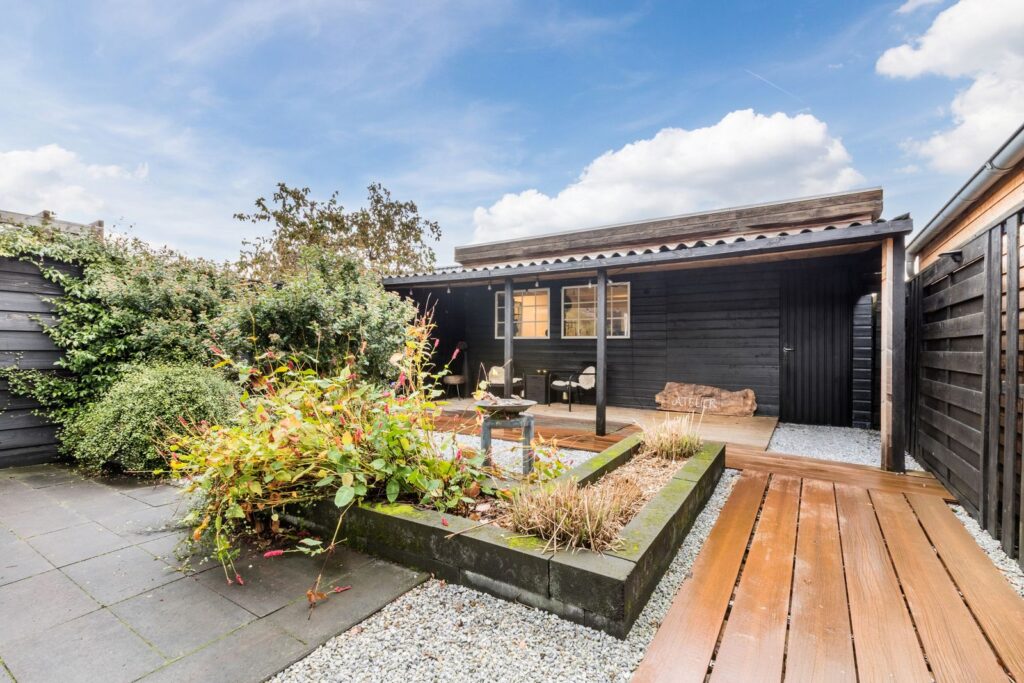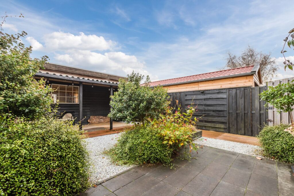 De nieuwe aangelegde zonnige achtertuin (2023) biedt veel privacy en is voorzien van een groot terras en knusse veranda/overkapping. Achterin de tuin staat het grote atelier/werkruimte (6x7m) met inpandige schuur, 2e keuken en toilet. Hier nog een 2e stoppenkast met krachtstroom.