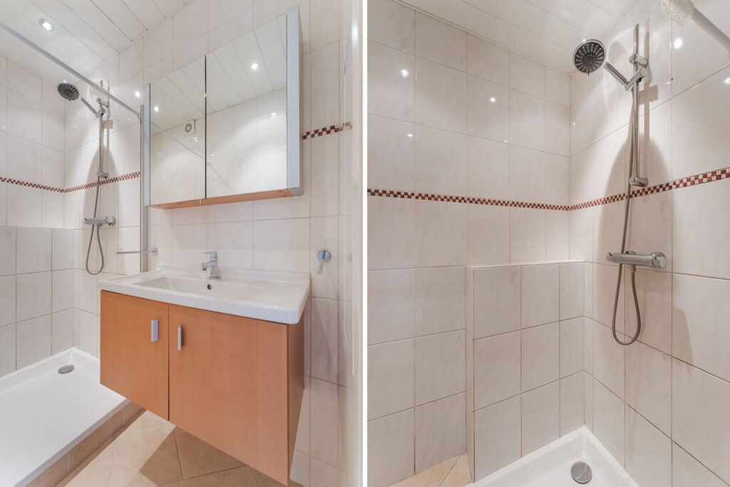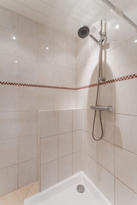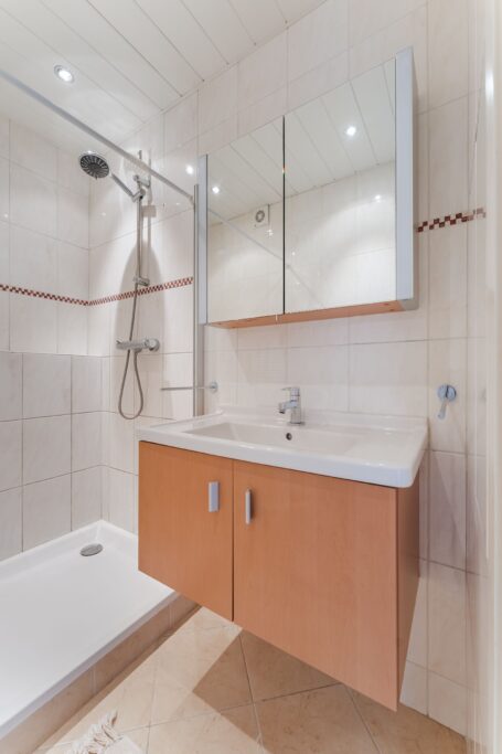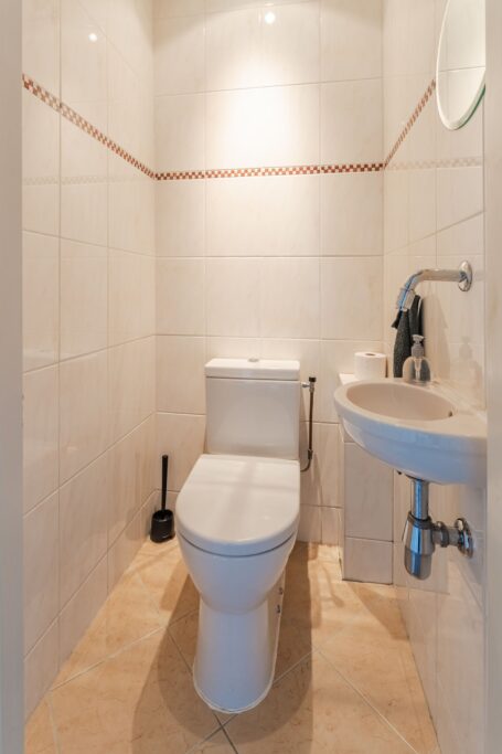 Het balkon van circa 5 m² is gunstig gelegen op het oosten – een heerlijke plek om ’s ochtends van de zon te genieten. De licht betegelde badkamer is uitgerust met een douche, wastafel met meubel en radiator. Het separate toilet is eveneens licht betegeld en voorzien van een fonteintje.