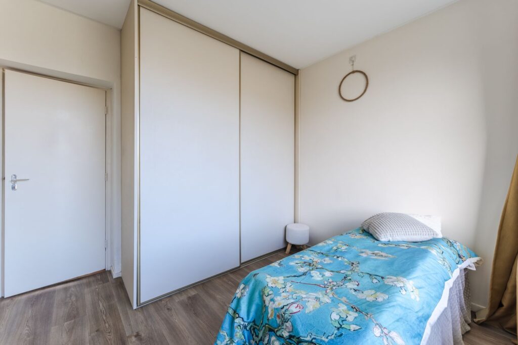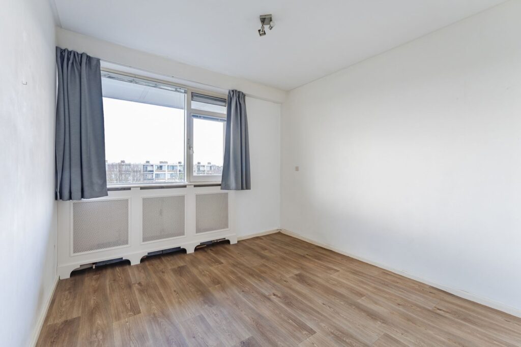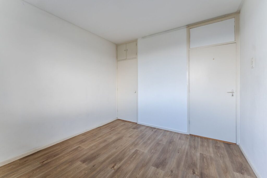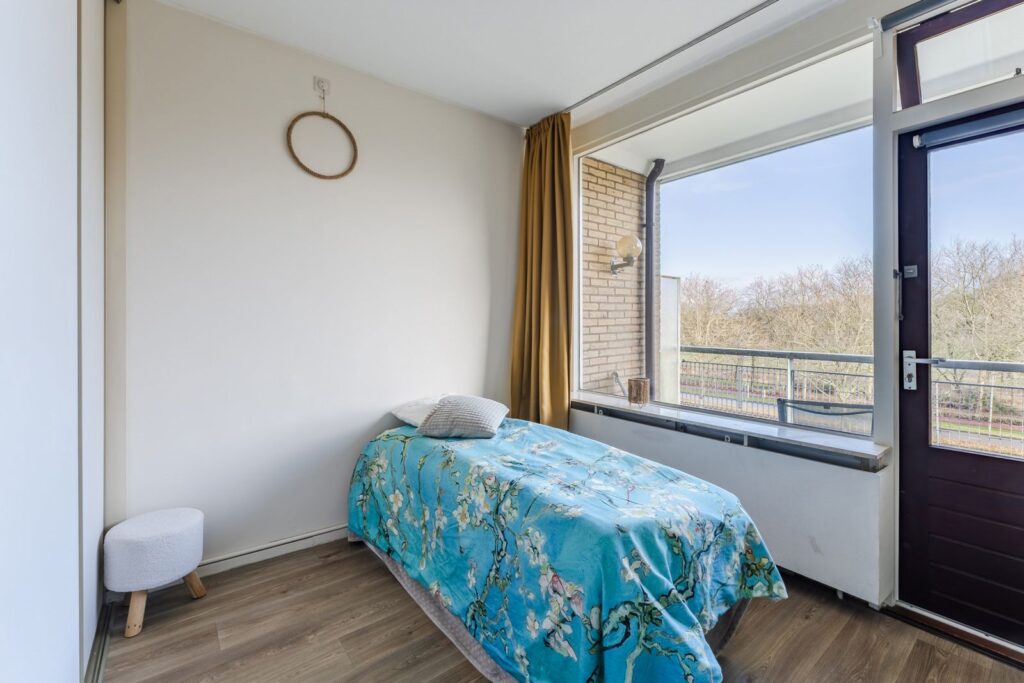 Via de tussenhal zijn de overige vertrekken bereikbaar. De eerste slaapkamer meet 3,16 x 3,32 meter en beschikt over een inbouwkast; hier hangt tevens de boiler. De tweede slaapkamer, gelegen aan de balkonzijde, is 3,15 x 3,14 meter groot en biedt directe toegang tot het balkon. Deze kamer is voorzien van een grote kastenwand met schuifdeuren tot aan het plafond.