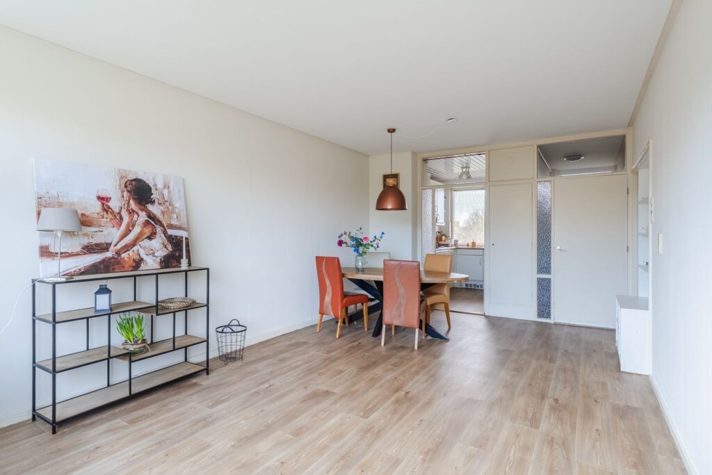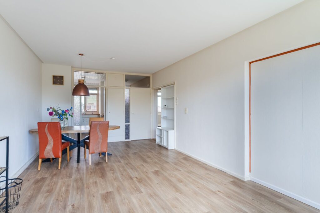 Je komt binnen in de entree/hal met meterkast, garderobe en intercom. Vanuit hier bereik je de woonkamer, die met zijn afmetingen van 6,99 x 3,67 meter (circa 25,3 m²) het hart van het appartement vormt. Dankzij de grote raampartijen is het hier heerlijk licht en geniet je van een vrij uitzicht over het groen en de omgeving van het nabijgelegen Park Transwijk. De ruimte laat zich eenvoudig indelen met een comfortabele zithoek en een royale eettafel. Er is bovendien de mogelijkheid om het tussenwandje (met oranje lat) te verwijderen en de aanwezige deur terug te plaatsen, of juist te kiezen voor een open ruimte aan de raamzijde.