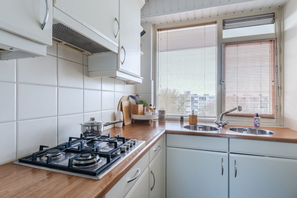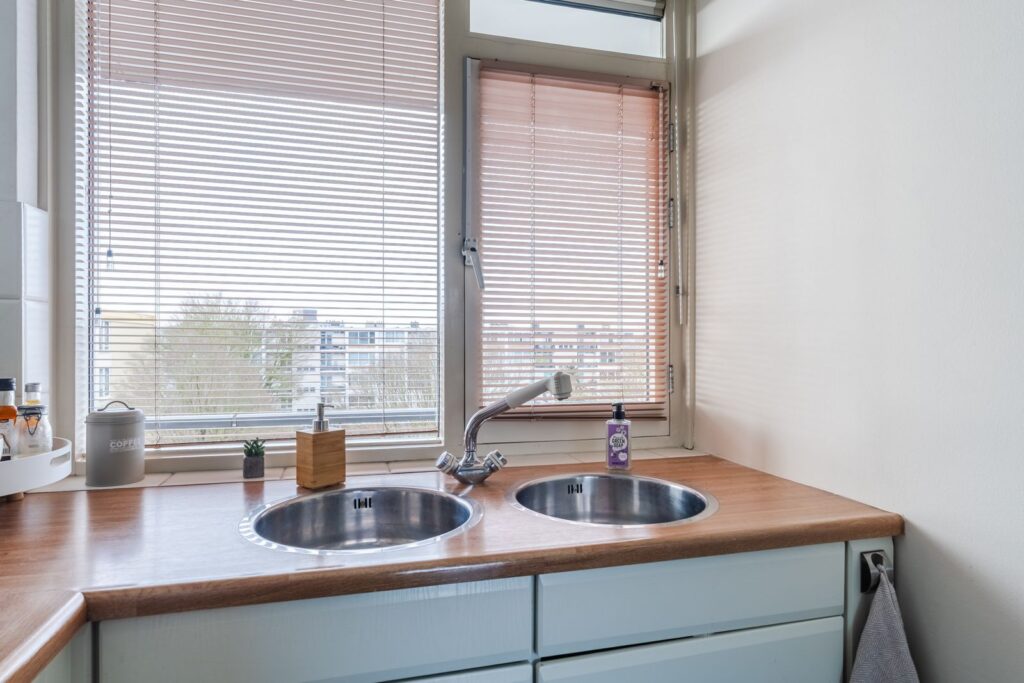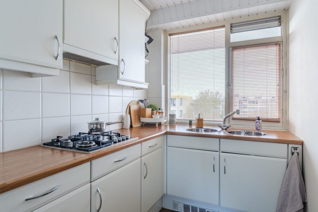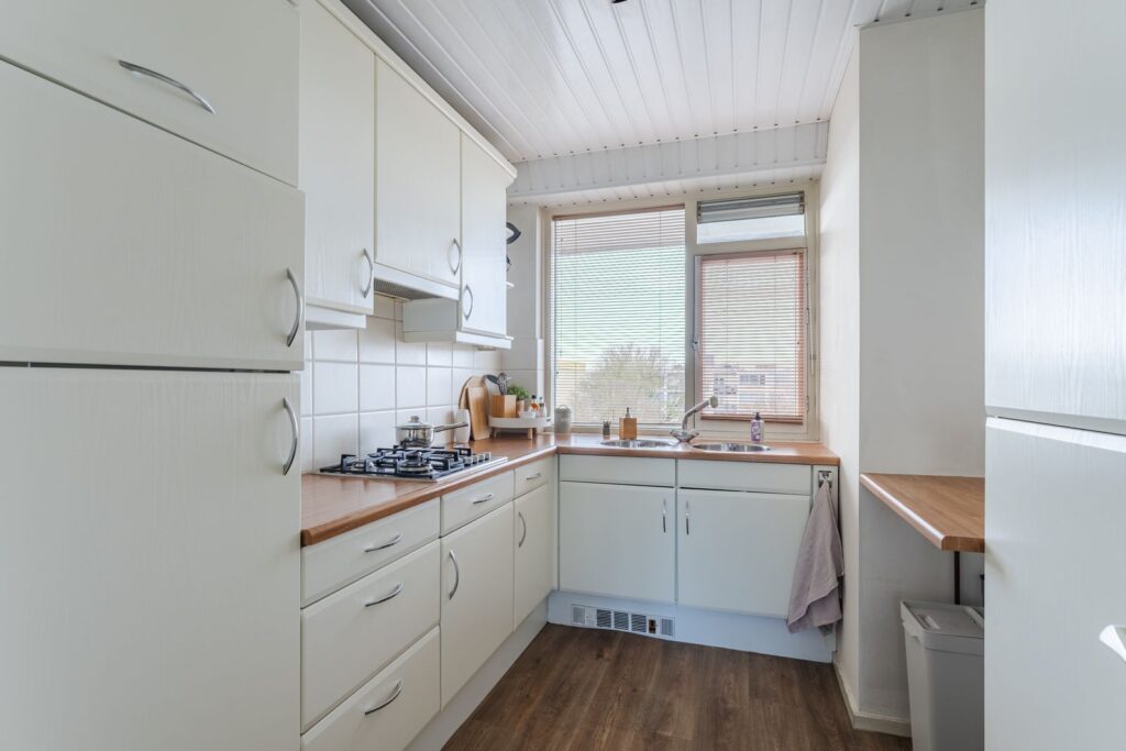 Via de woonkamer bereik je de keuken (circa 9 m²), voorzien van een gaskookplaat, inbouwkoelkast met groot vriesvak en extra kastruimte tot aan het plafond met veel opbergmogelijkheden. Hier bevindt zich ook de wasmachineaansluiting. De opstelling is praktisch en functioneel, met een prettige scheiding tussen koken en wonen.