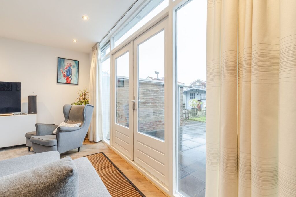 • Royale woonkamer in de uitbouw, voorzien van een lichtkoepel en openslaande deuren naar de achtertuin.