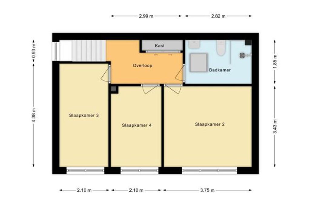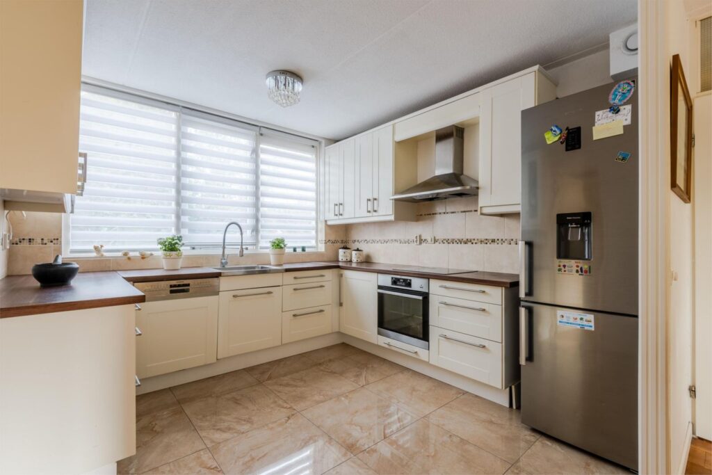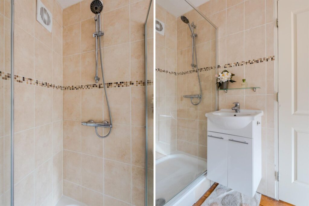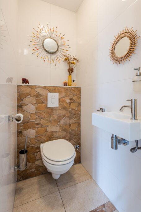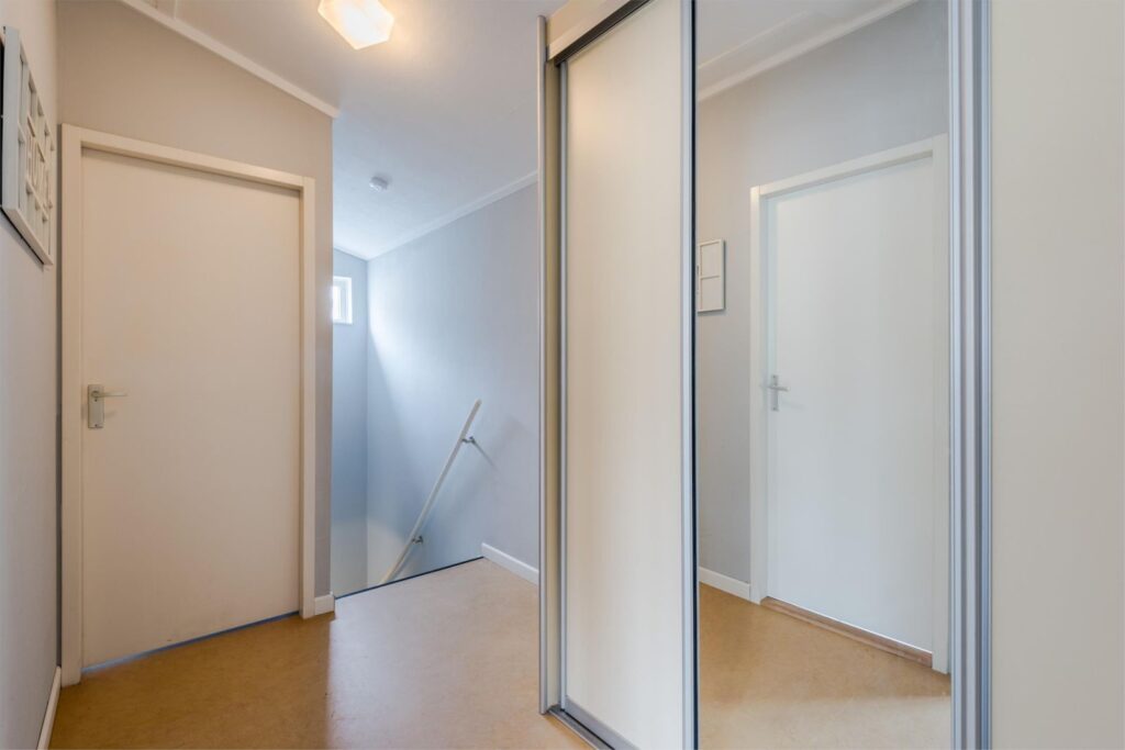 Overloop met vaste kastruimte, toegang tot de badkamer en drie slaapkamers, waarvan één de ruime ‘master bedroom’ is. De badkamer is uitgerust met een inloop douche (ook voorzien van stortdouche), een tweede zwevend toilet, wastafelmeubel, luxe handdoekradiator en tegelwerk tot het plafond.