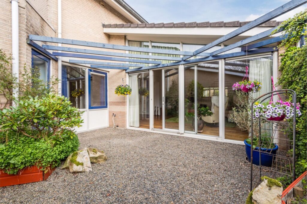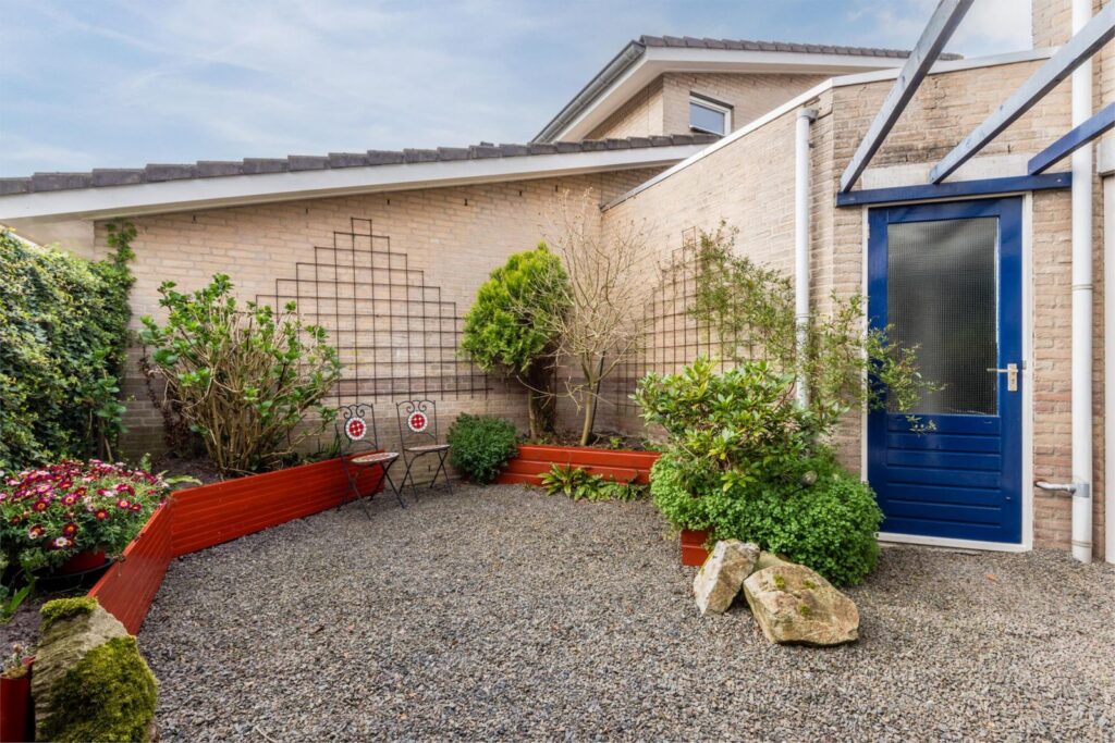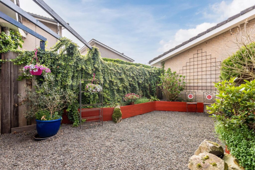 Aan de voorzijden is de voortuin waar je tot laat met veel privacy kunt genieten van de zon. Er is een ook eigen parkeerplaats die ruimte biedt voor twee auto’s. De achtertuin is van het type ‘patio’ en geeft veel vrijheid. De patio is ingericht met vaste plantenbakken en een pergola.