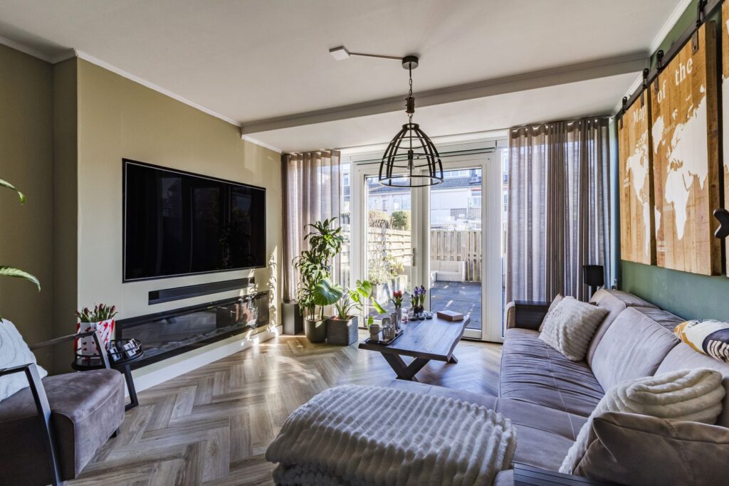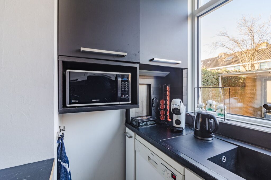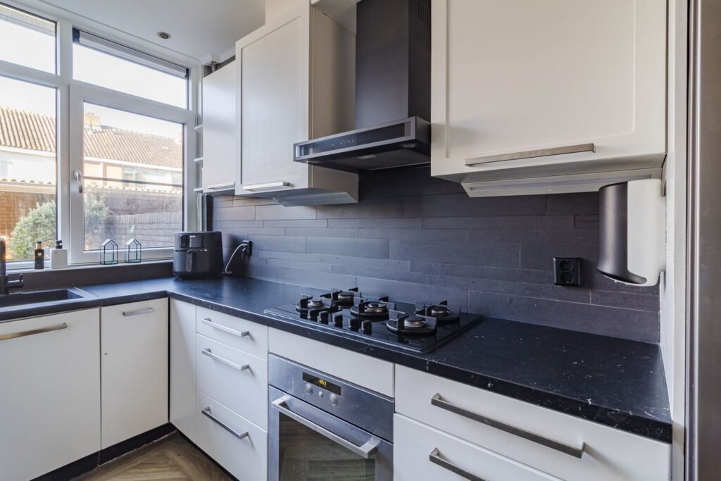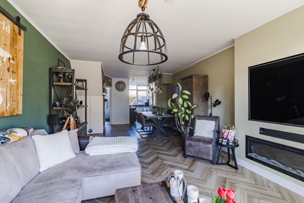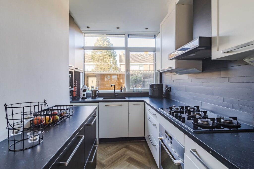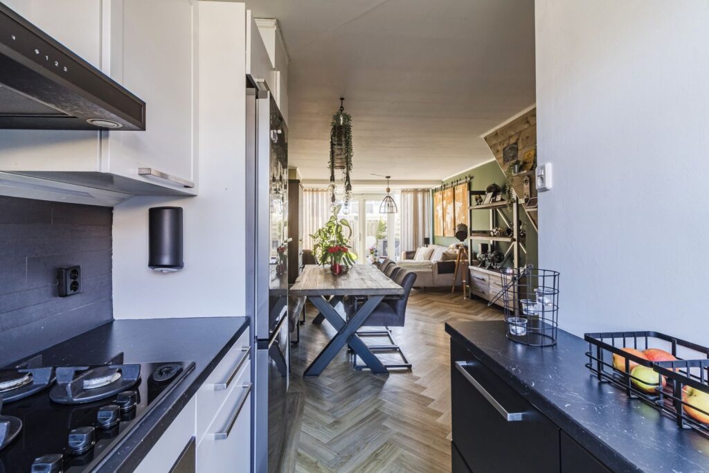De ruime en lichte woonkamer (ca. 8.80 x 4.10) is voorzien van een pvc vloer en beschikt over openslaande deuren naar de achtertuin. Dankzij de grote raampartijen is dit een heerlijke leefruimte met veel lichtinval. De moderne open keuken is uitgevoerd in een praktische hoekopstelling en voorzien van diverse inbouwapparatuur, waaronder een 5-pits gaskookplaat, vaatwasser, afzuigkap en oven.