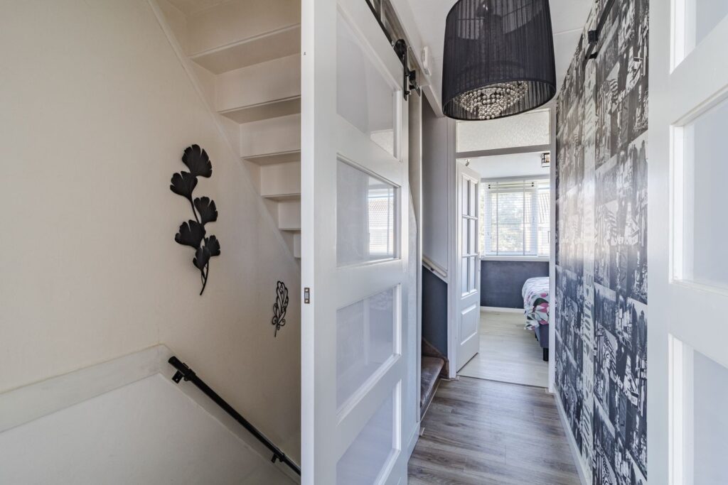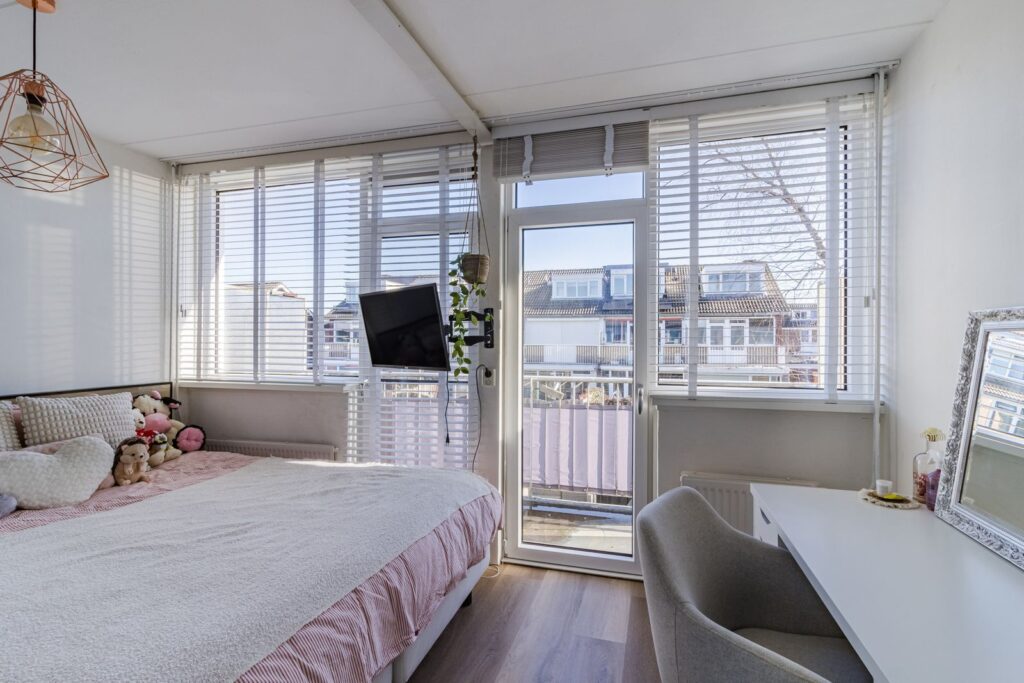 Overloop met trapopgang naar de tweede verdieping. Aan de voorzijde bevindt zich een royale, gevelbrede slaapkamer. Aan de achterzijde ligt eveneens een ruime slaapkamer over de volle breedte van de woning, met openslaande deuren naar het balkon (ca. 5.00 x 1.00).