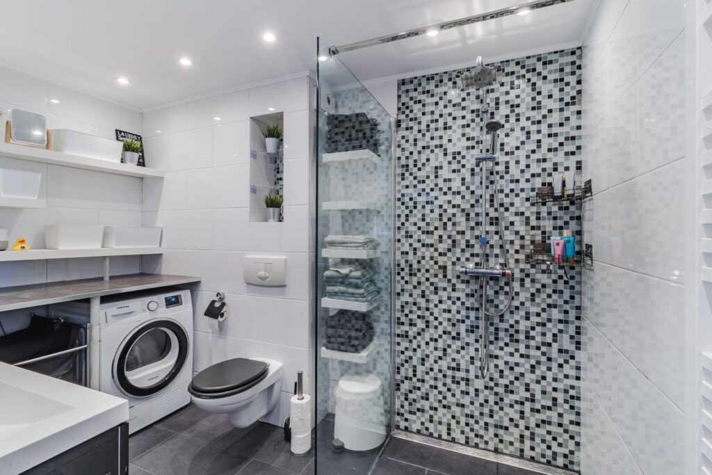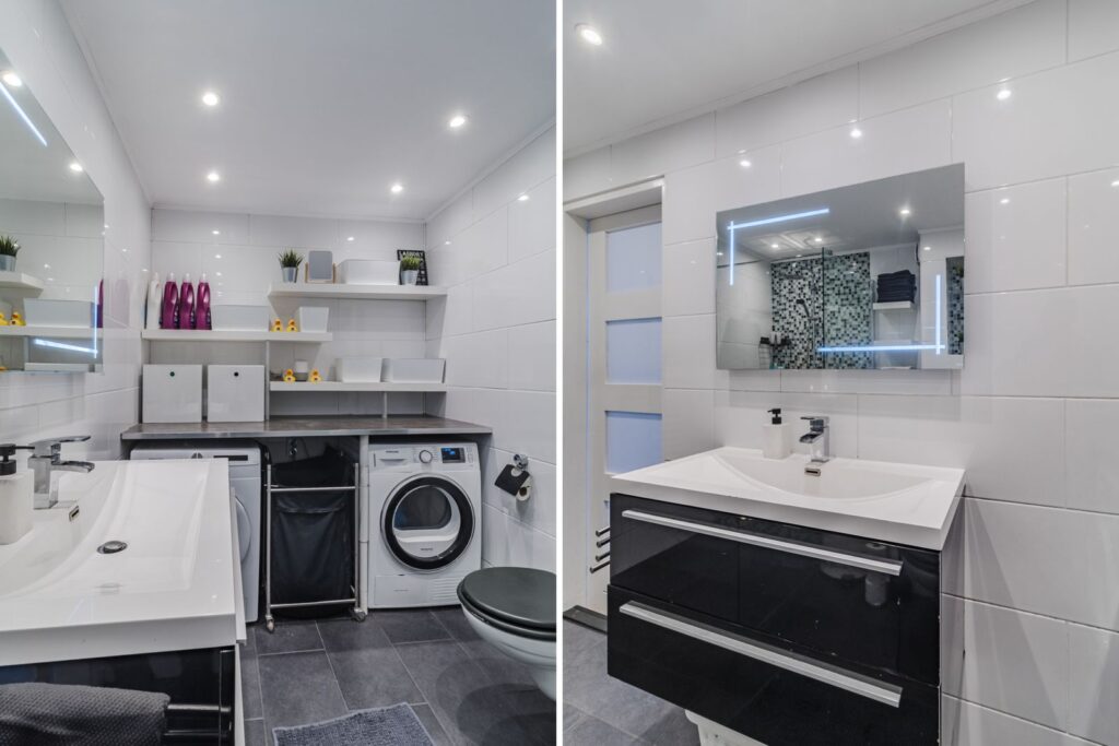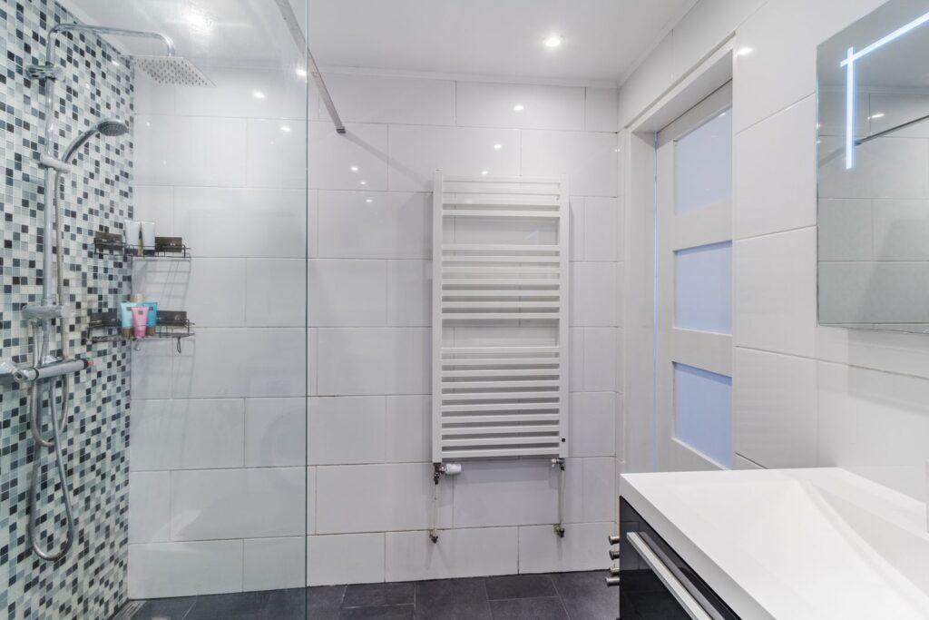 De vergrote, licht betegelde badkamer (ca. 3.10 x 2.15) is compleet uitgevoerd met een inloopdouche, wastafelmeubel, toilet, handdoekradiator en aansluiting voor de wasmachine.