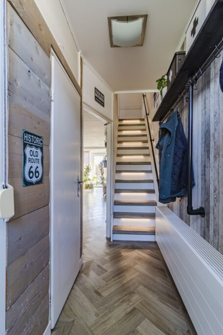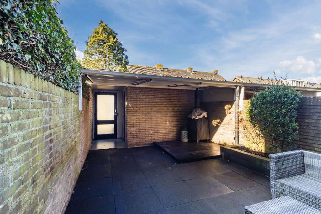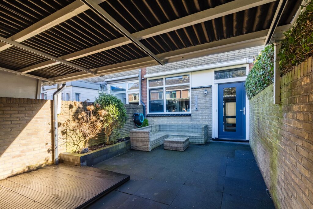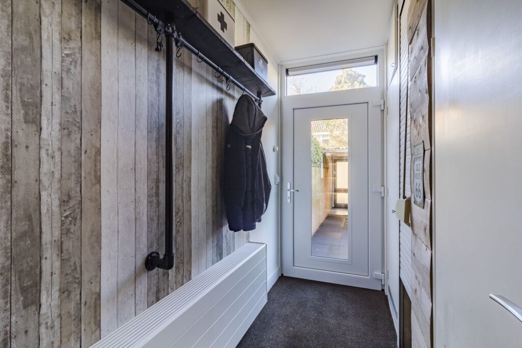 Via de diepe voortuin, voorzien van een veranda en een stenen berging (ca. 2.85 x 2.20) met vernieuwde dakbedekking, bereikt u de entree van de woning. In de hal bevinden zich de meterkast, de trapopgang en een moderne toiletruimte.